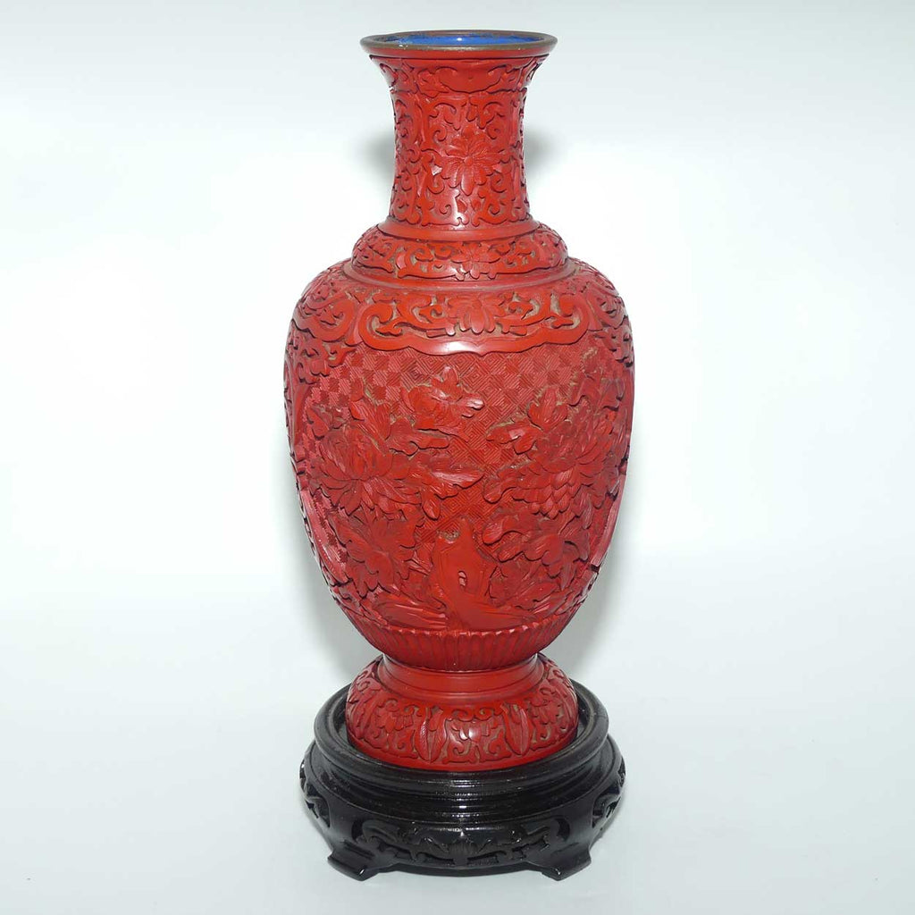 Very tall Cinnabar on Enamelled Brass Floral design vase with wooden Base
