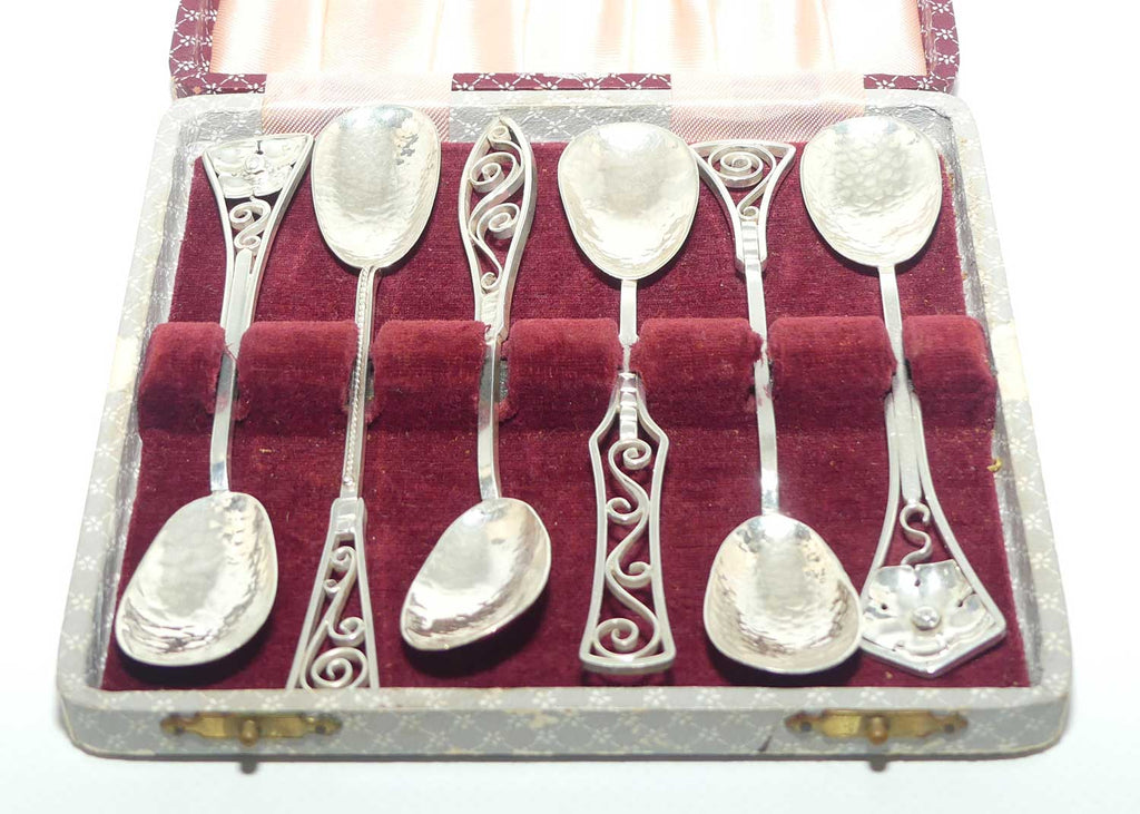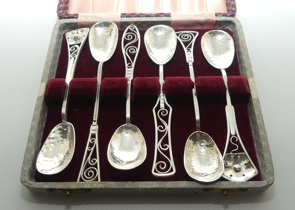 Australian Arts and Crafts hand beaten set of 6 tea spoons in original box