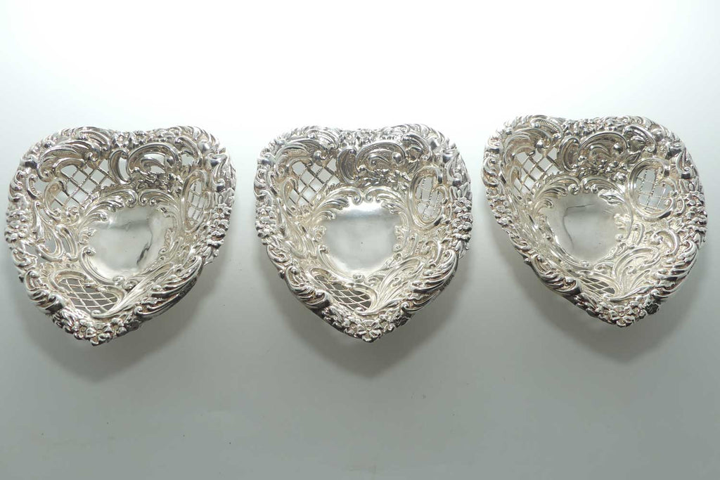 Boxed set of 3 Sterling Silver heart shape bon bon dishes on 3 ball feet