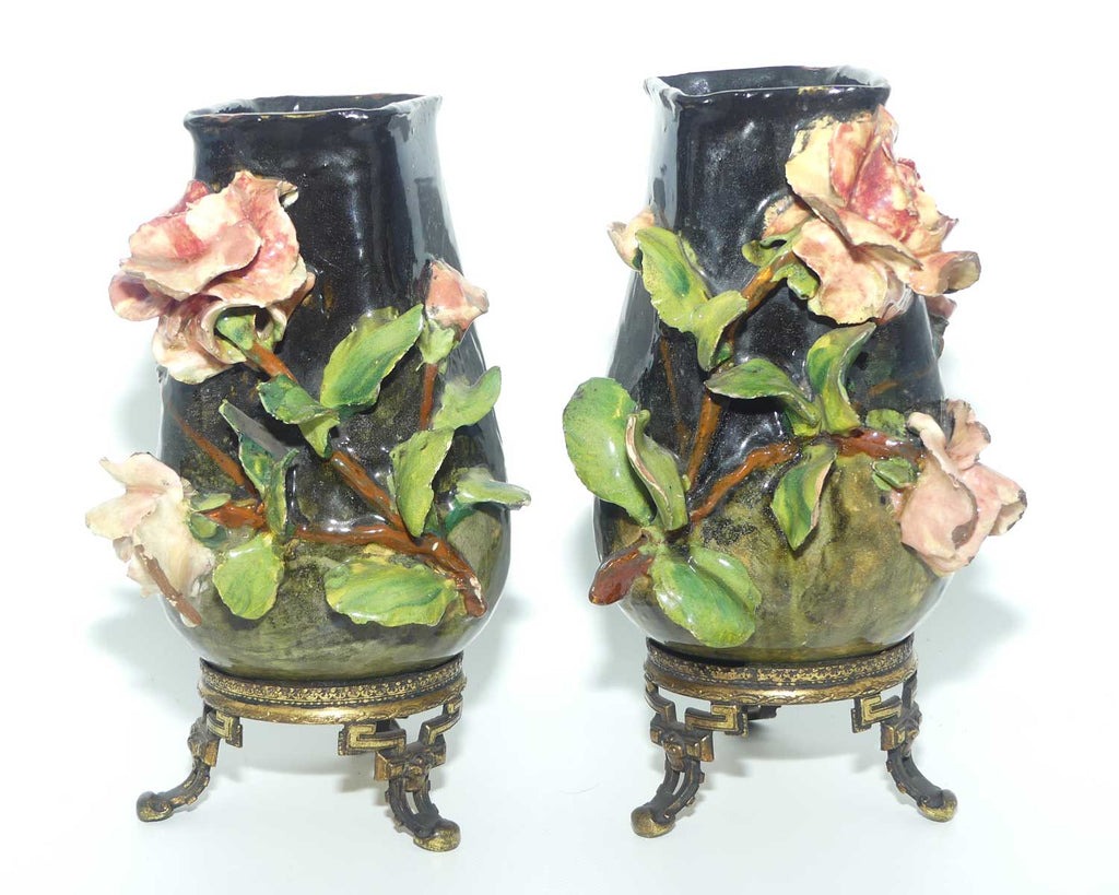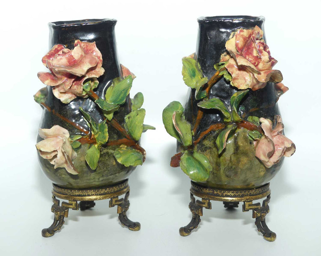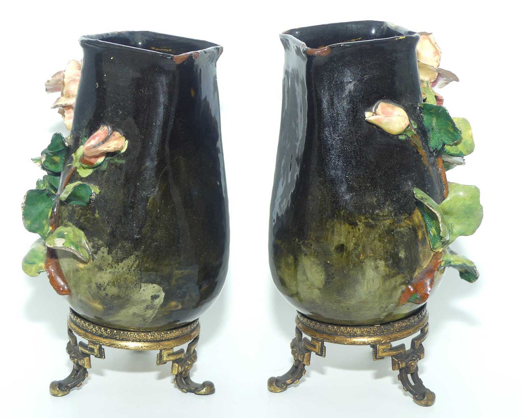 This beautiful pair of vases has a wonderful decorative aesthetic - unfortunately the edges of the flowers have sustained damage over the course of their lives, and there is some glaze loss to the edges of the rims of the vases. The bodies have an olive transition to black Majolica glaze and the vases look 'alive'.