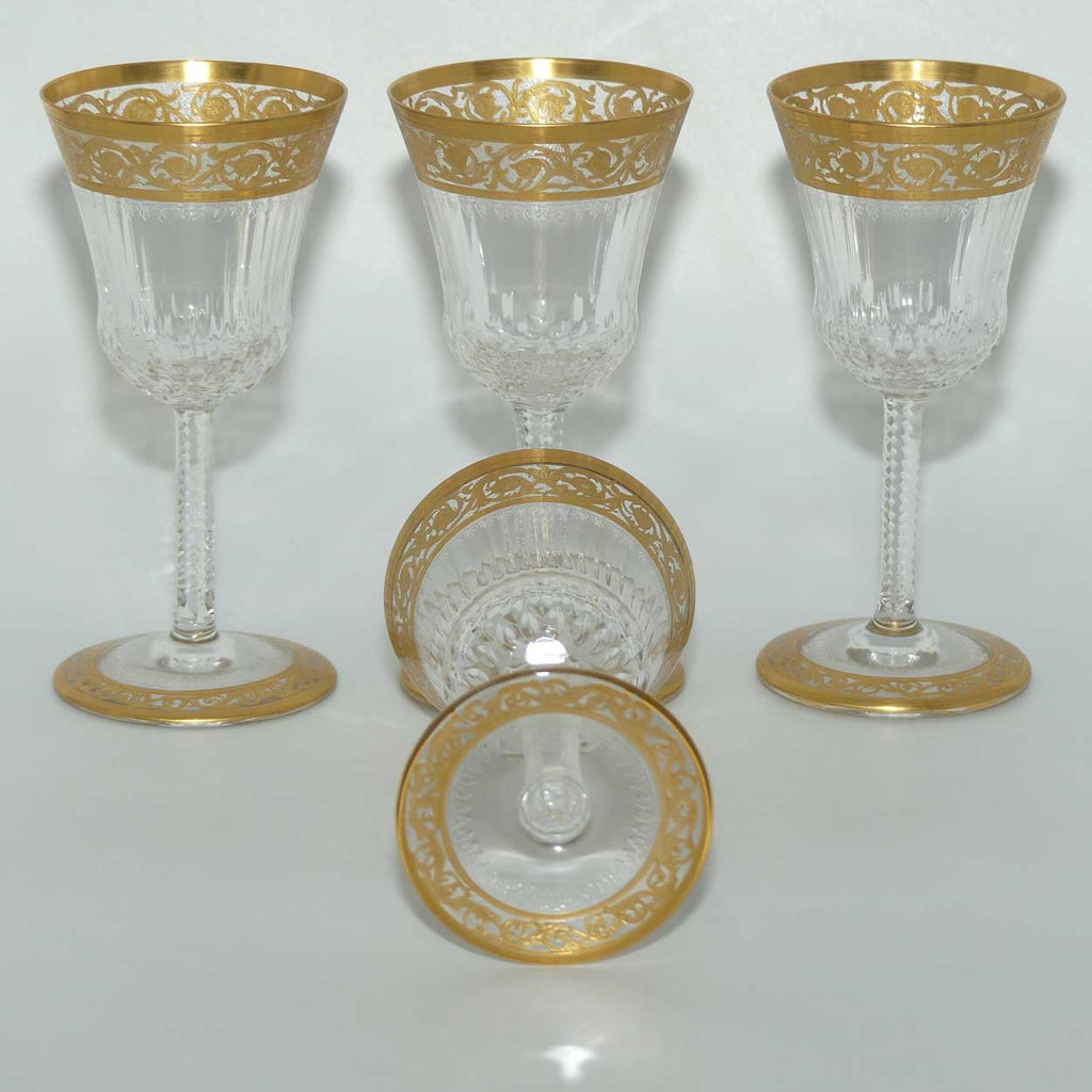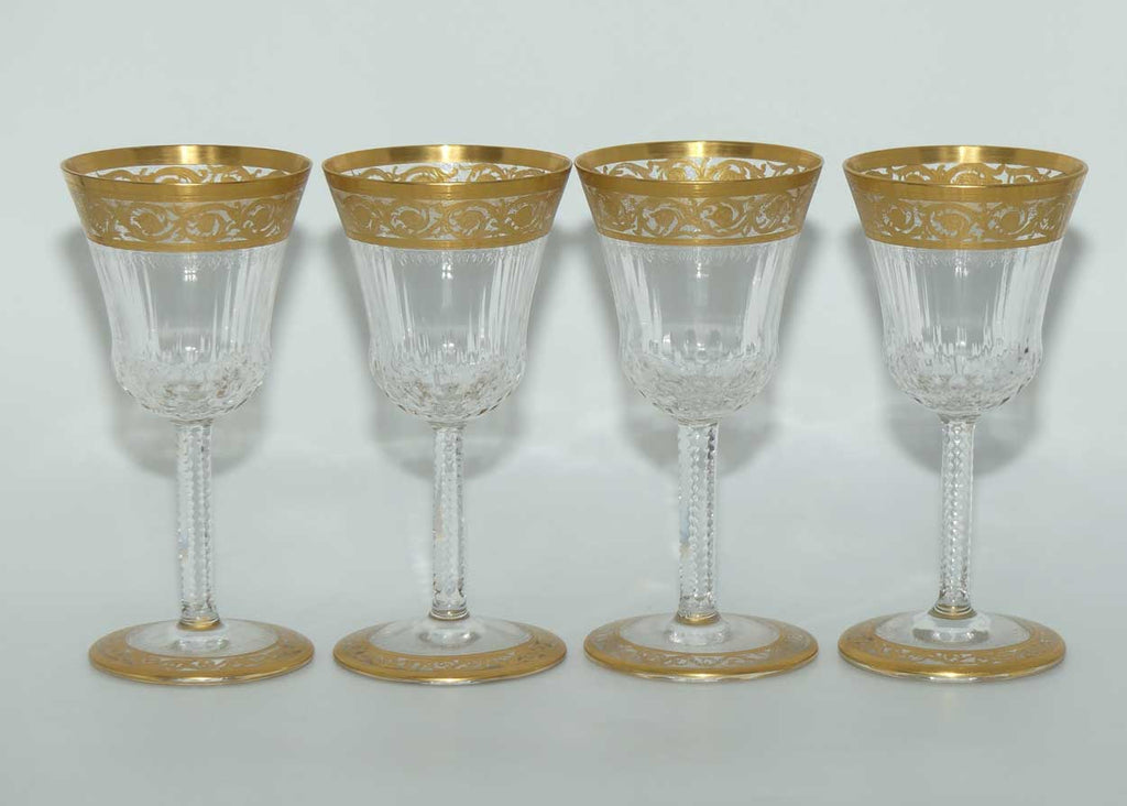 A set of 4 St Louis Crystal Thistle pattern flutes - clear in colour with the open border gilt trim around the foot (please note the open border gilt at the base as there are 2 variations of this pattern - some are a solid gold band, some are an open pattern - produced over many decades).