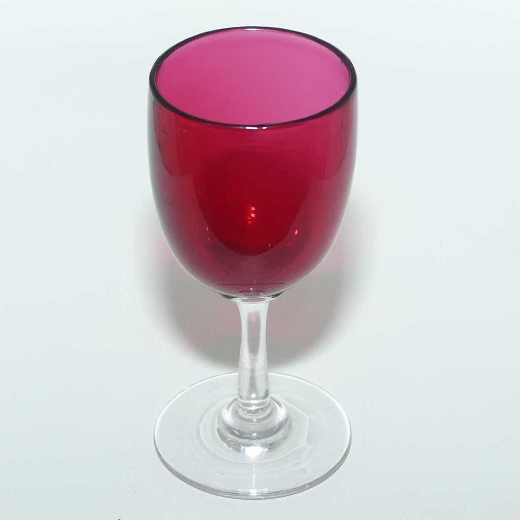 A traditional hand blown Cranberry wine glass, with a clear glass stem and foot