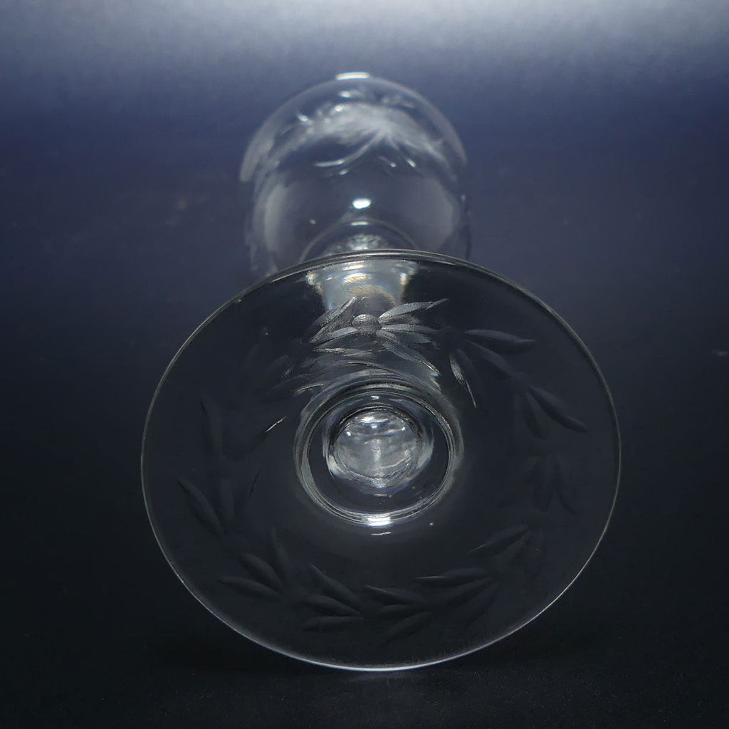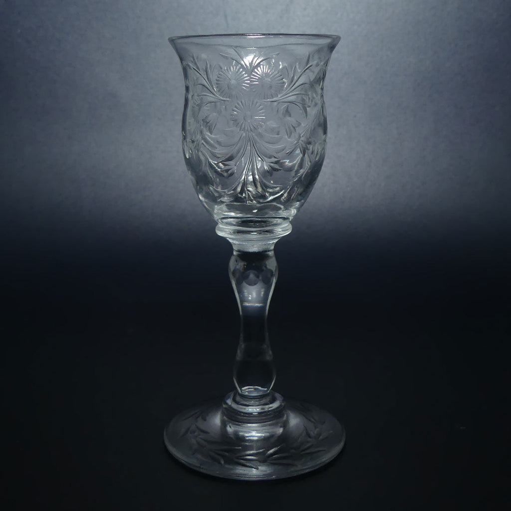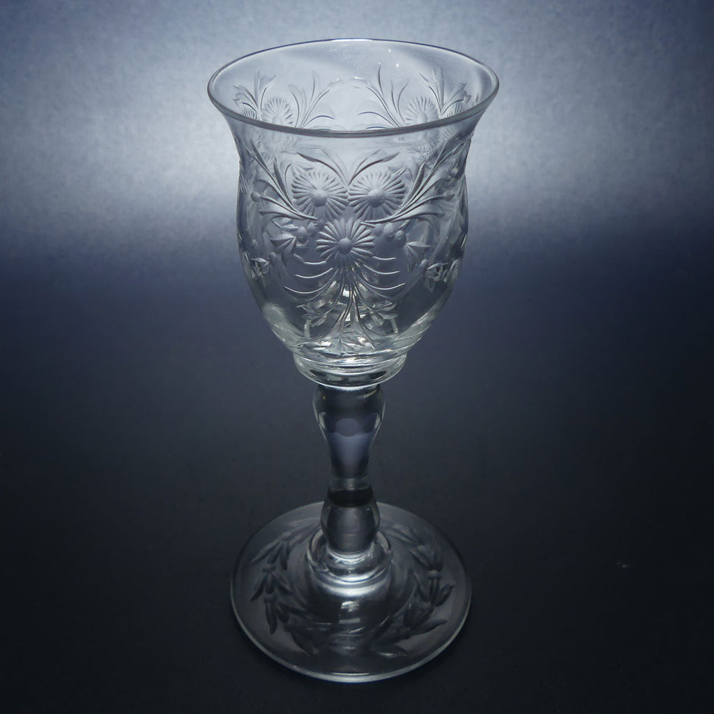 These tiny little glasses are a true work of Victorian era craftsmanship - there are 3 small decorations of 3 Daisies and scroll work around the bowl, small facets on the knop column and a circular pattern around the base