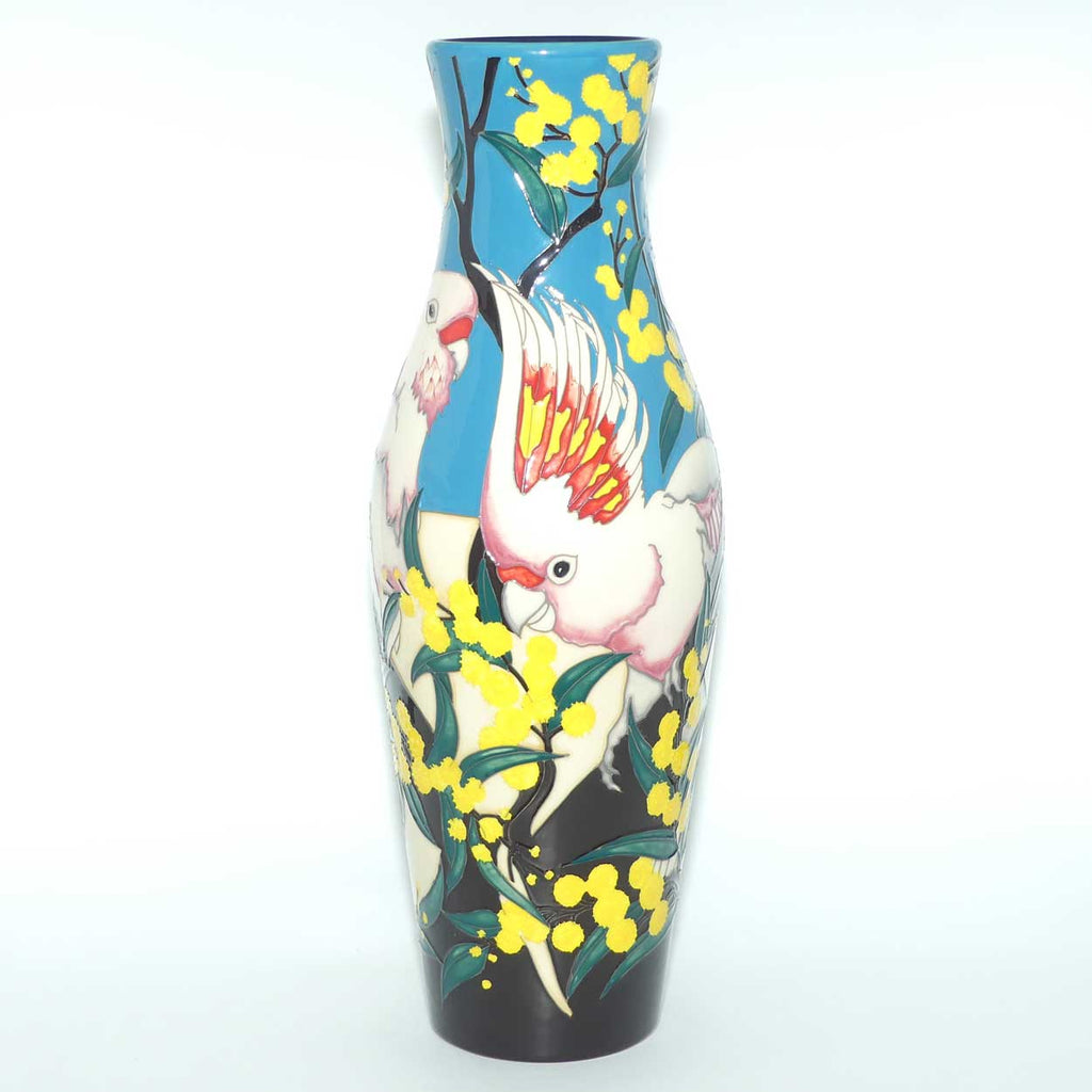 Perhaps a kindred spirt to Major Mitchell, Moorcroft designer Vicky Lovatt was also awe struck by the almost comical flamboyancy of this exotic bird. With an ability to appreciate and select distinctive details from unusual creatures such as the cockatoo, Vicky relays imagery like no one else working in pottery today. This design, featuring threee Major Mitchell Cockatoos all in various positions among yellow vibrant wattle branches, captures what a close encounter with these colourful and curious natured birds would feel like. Always bringing us closer to the awesome ways of nature, Vicky has yet again brought a superb Australian creature to life.