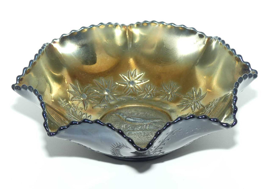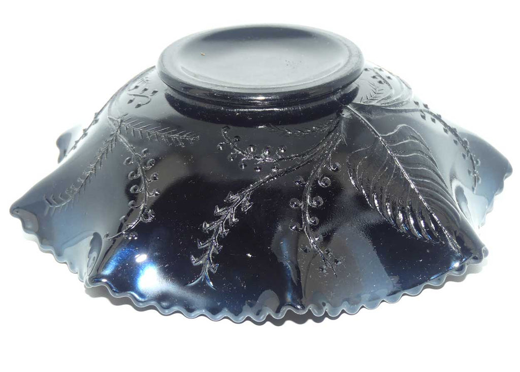 Please not: this bowl has a great clean strike. It has a particularly uncommon colour of iridescence to the inside of the bowl, a lustrous type of Gun metal finish - this is simply a product of the iridising treatment that this example received. The outer side of the bowl is jet black and has no iridescence to speak of. A great collector example that shows the variance that can be achieved in Australian Carnival glass!