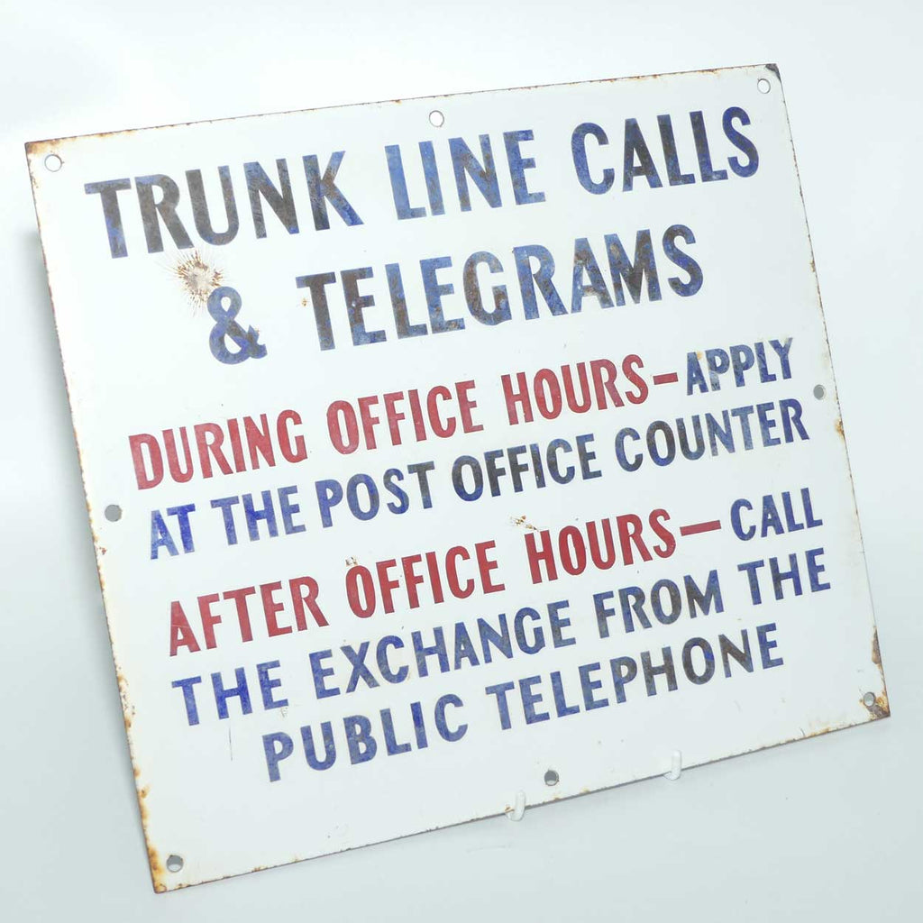 Sign reads: Trunk Line Calls & Telegrams | During Office Hours - Apply at the Post Office Counter | After Office Hours - Call the Exchange from the Public Telephone