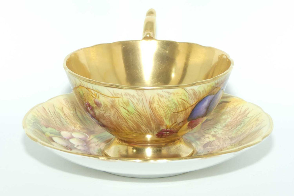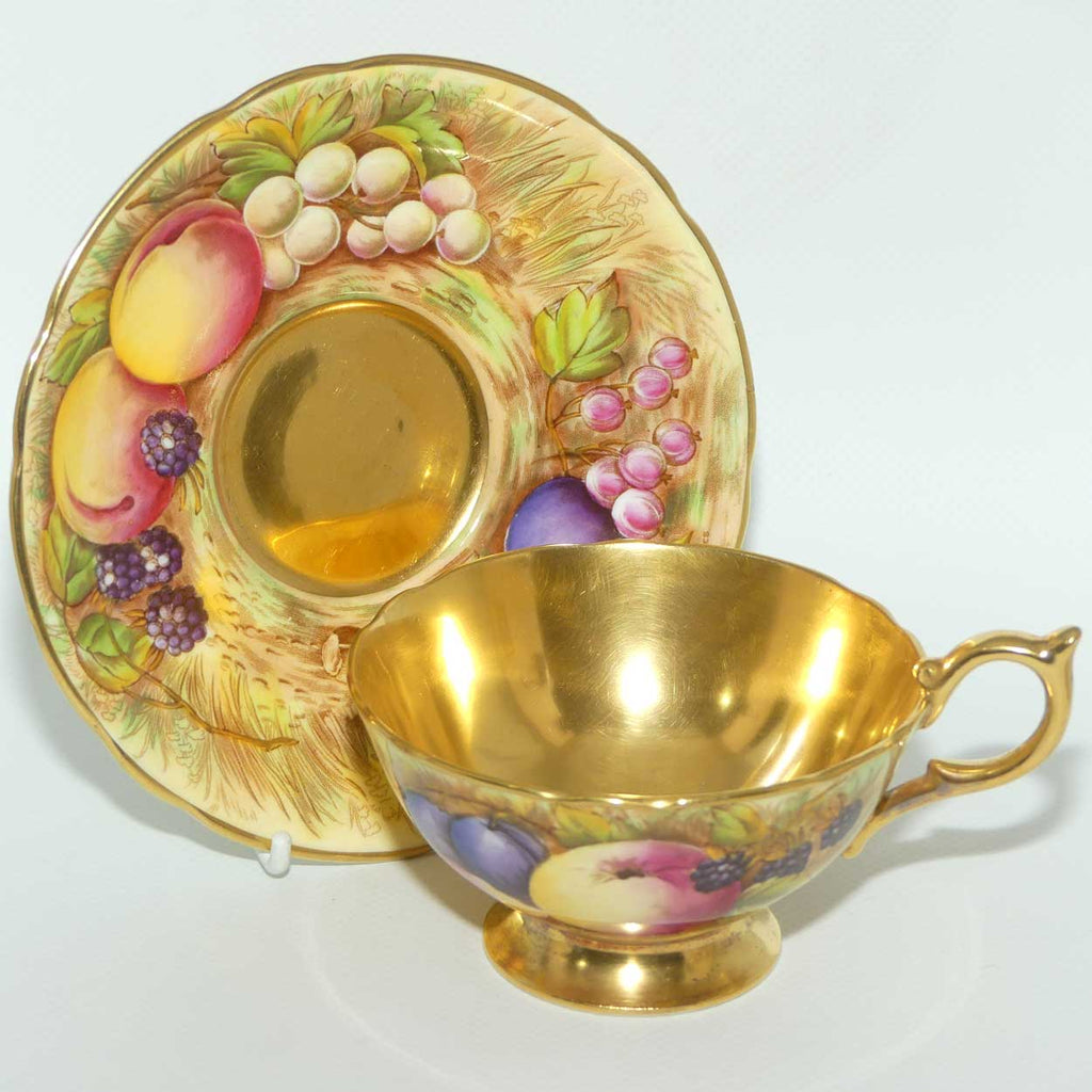 The design on the tea cup is signed N Brunt - the tea cup is internally decorated with superb gilt. The design on the saucer is signed D Jones. This is very standard for Aynsley to have 2 differing signatures on the designs, the Brunt design was best suited for tea cups, the Jones design best suited to saucers. The respective designs were used for many years and pair perfectly together.