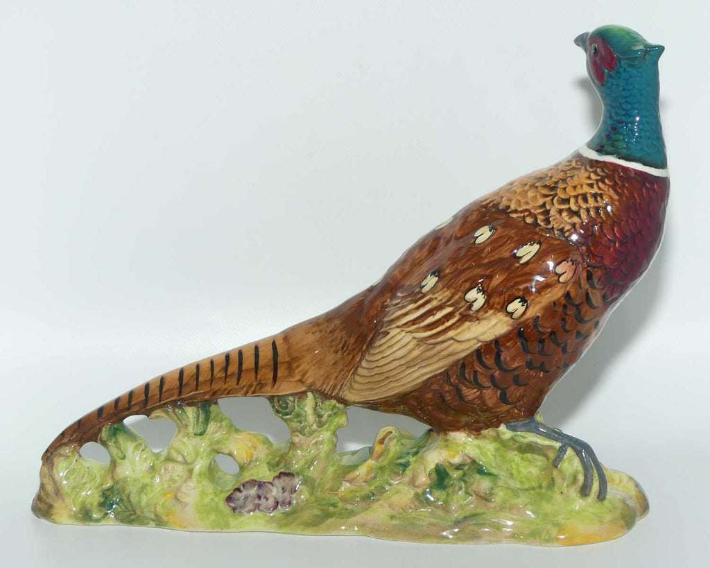 There are two versions of this large Pheasant, the FIRST VERSION has flowers in high relief on the base, the later SECOND VERSION has no raised flowers on the base [there are 3 on the rear side, that are slightly modelled and painted]
