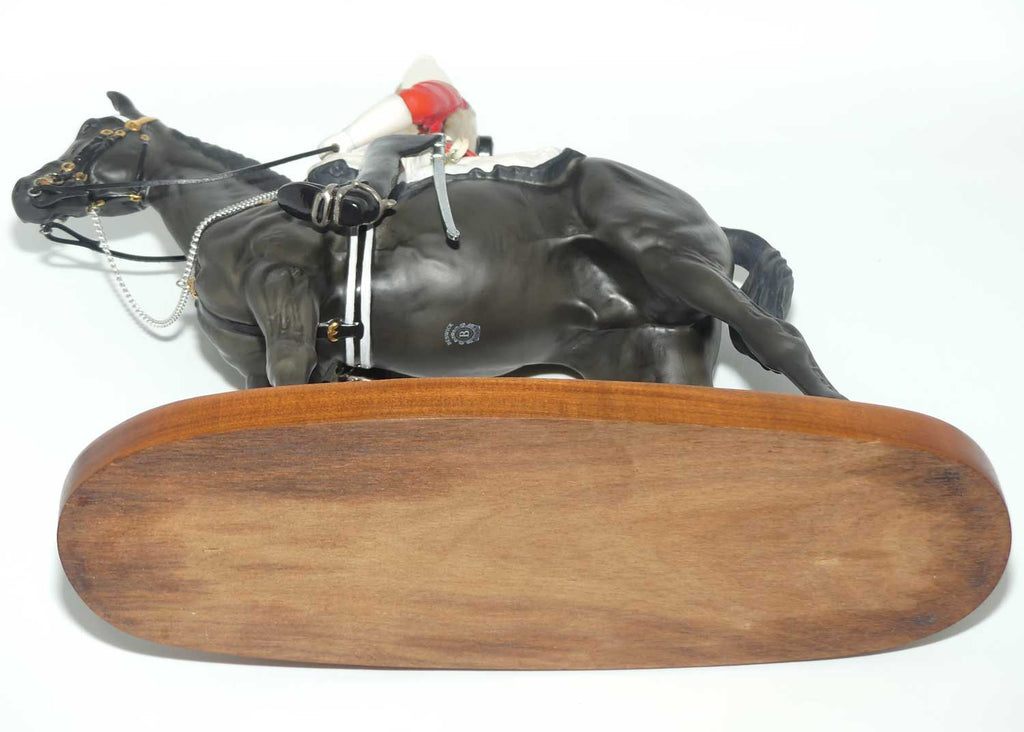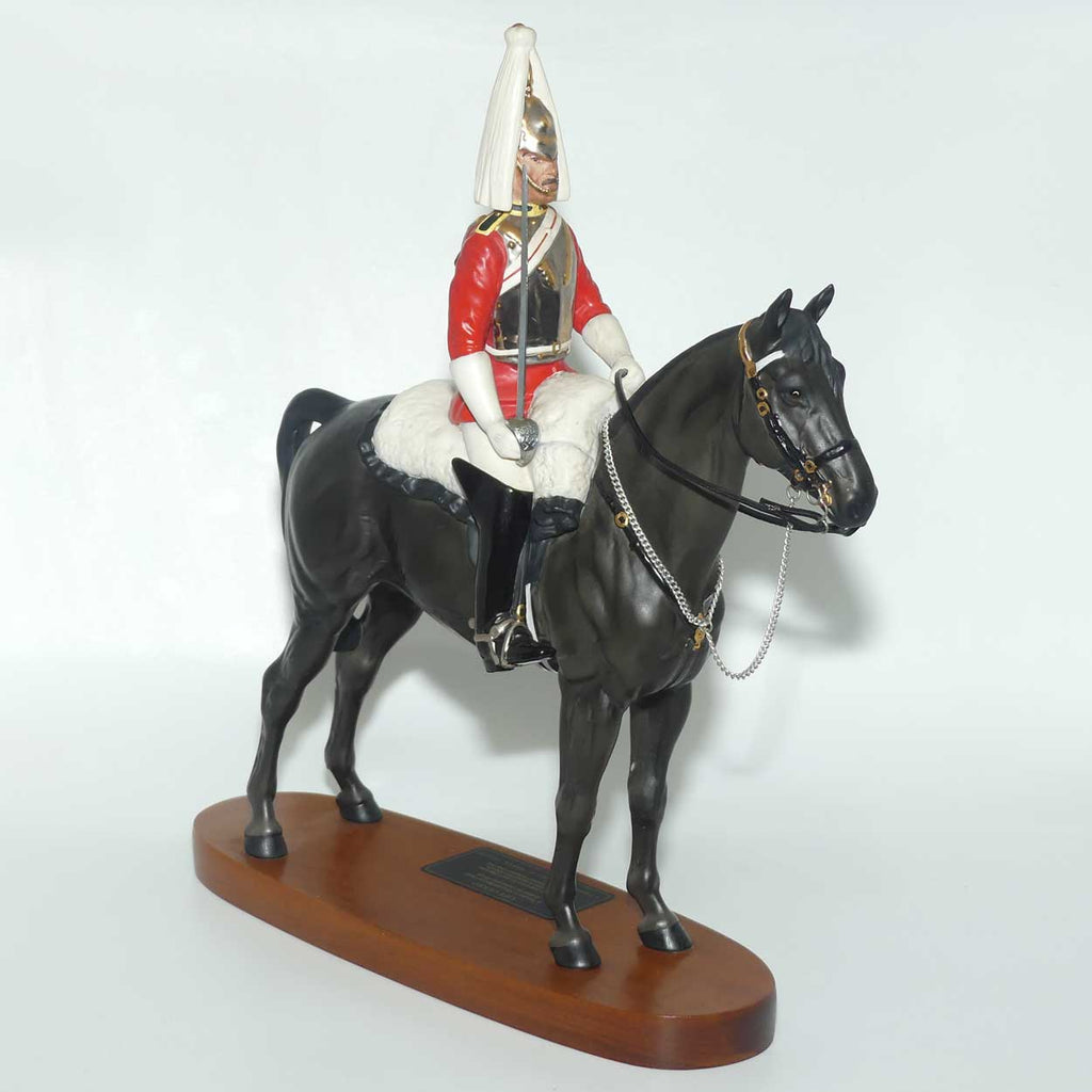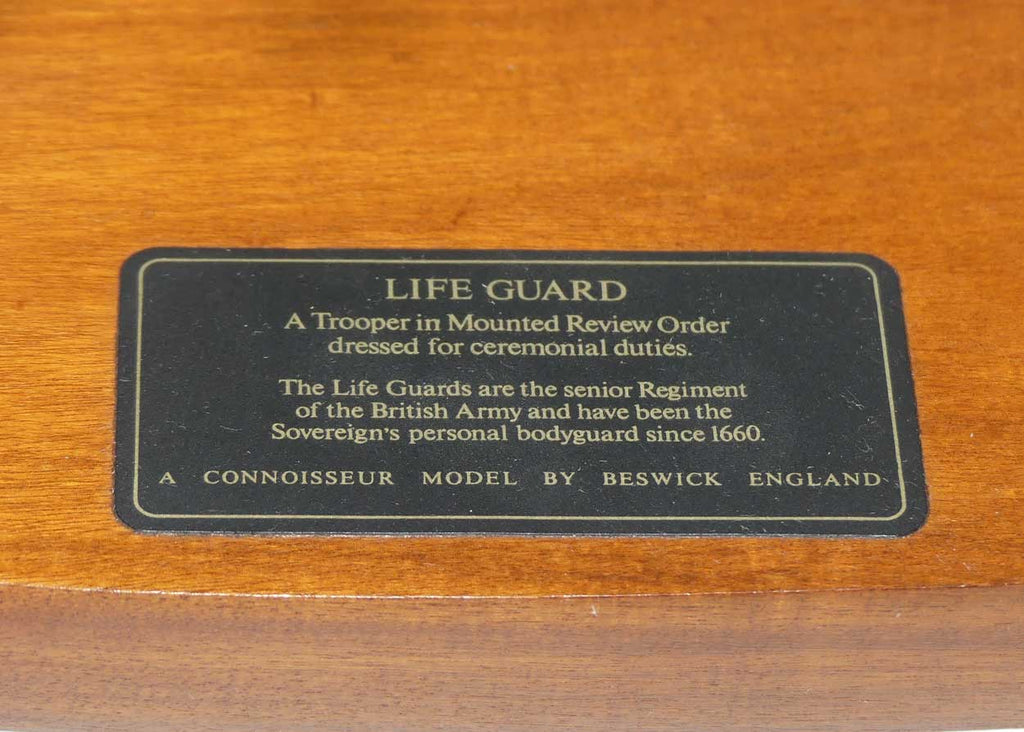 Plaque reads: Life Guard: A Trooper in Mounted Review Order dressed for ceremonial duties. The Life Guards are the senior regiment of the British Army and have been the Sovereign's personal bodyguard since 1660. A CONNOISSEUR MODEL BY BESWICK ENGLAND