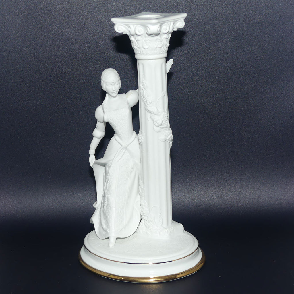 The tragic tale of Romeo and Juliet is one of the most enduring romances in Western literature. The ill fated lovers have been immortalised in almost every form, from opera to ballet to painting and sculpture, and of course, in William Shakespeare's timeless play. These candlesticks are by Stuart Mark Feldman and are handcrafted in fine bisque porcelain, hand finished and embellished with 24 KT gold.