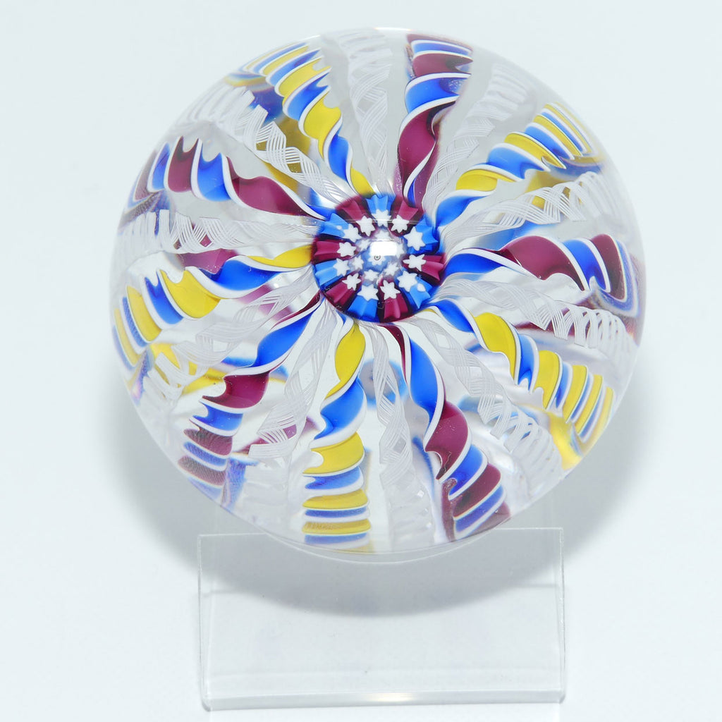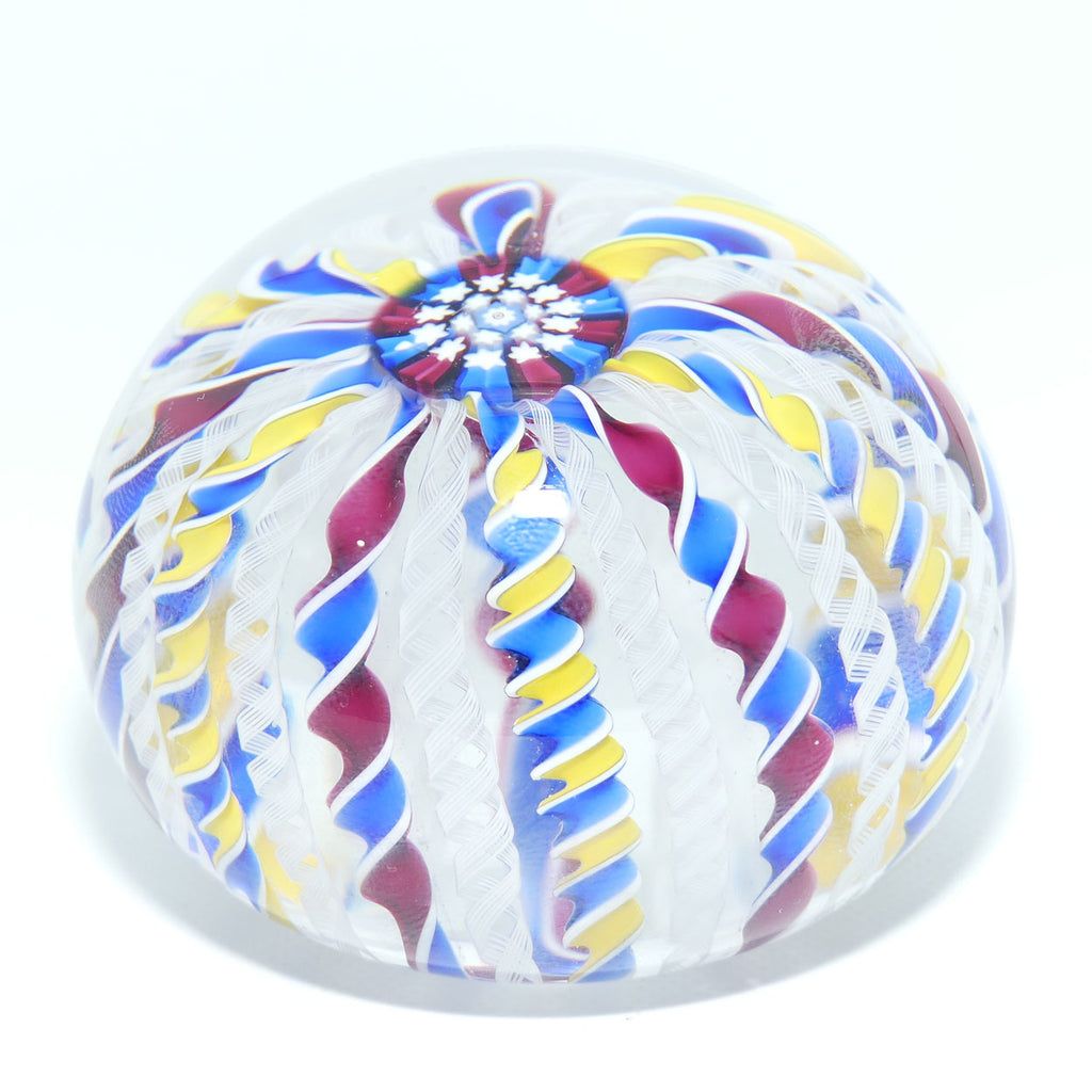 The Staves radiate from a central Crown Complex Cane. The Coloured Staves reveal alternating colours as they twist around. Blue and Yellow Staves and Blue and Magenta Staves are separated by a White Latticino twist cane.