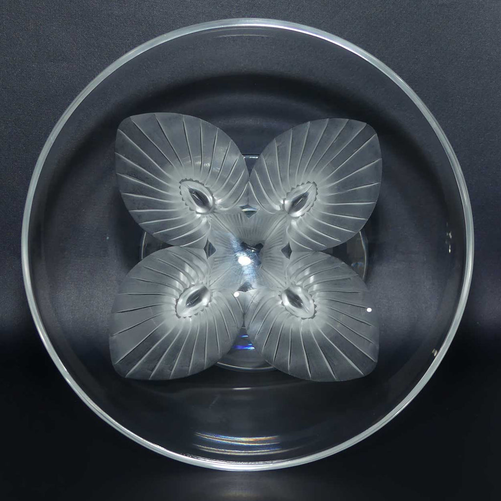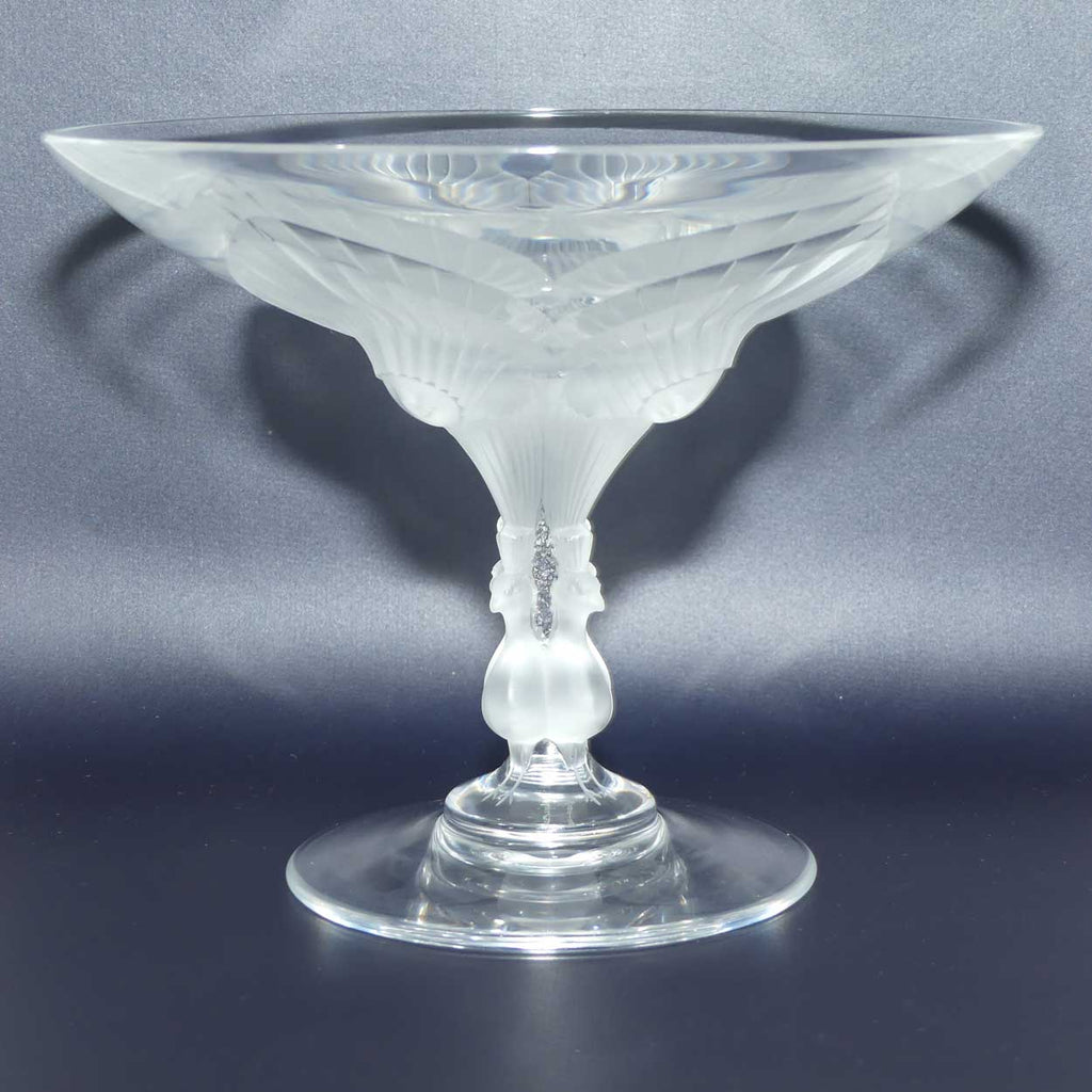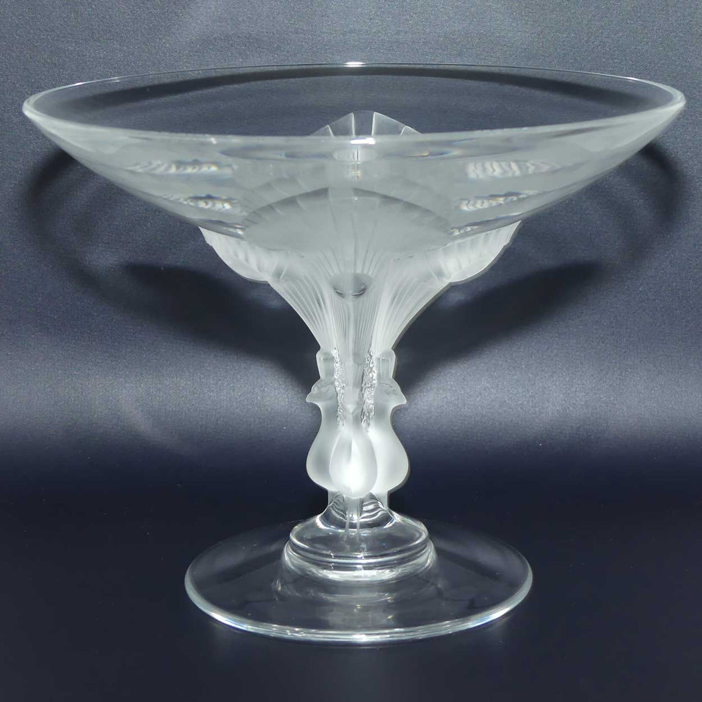 A superb Marc Lalique design decorative crystal comport - the stem is in the shape of 4 opposing peacocks, their claws beautifully engraved into the base and their magnificent plumage extends into the decoration of the underside of the comport - truly carved with a precision only Lalique can achieve. Whether viewing this piece from the side - or from above, you can see a style and excellence in Lalique's design.
