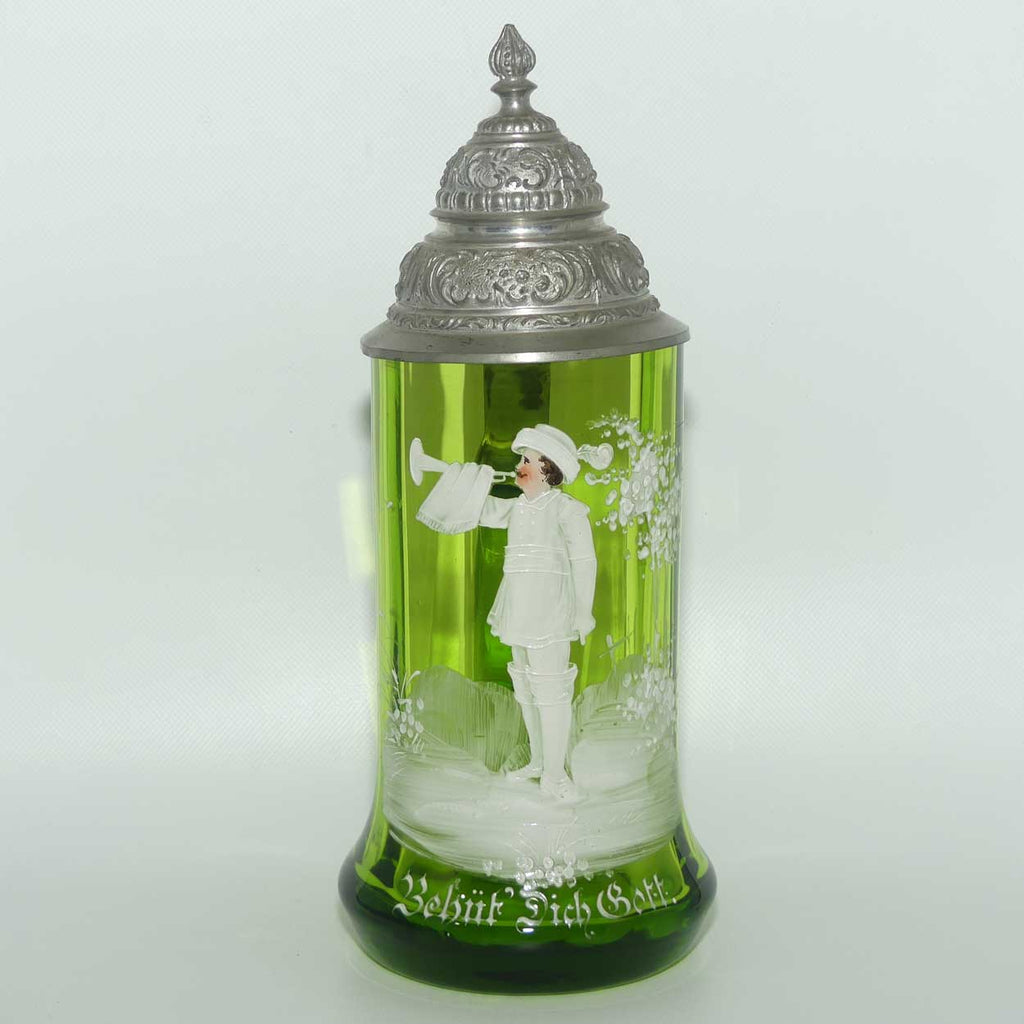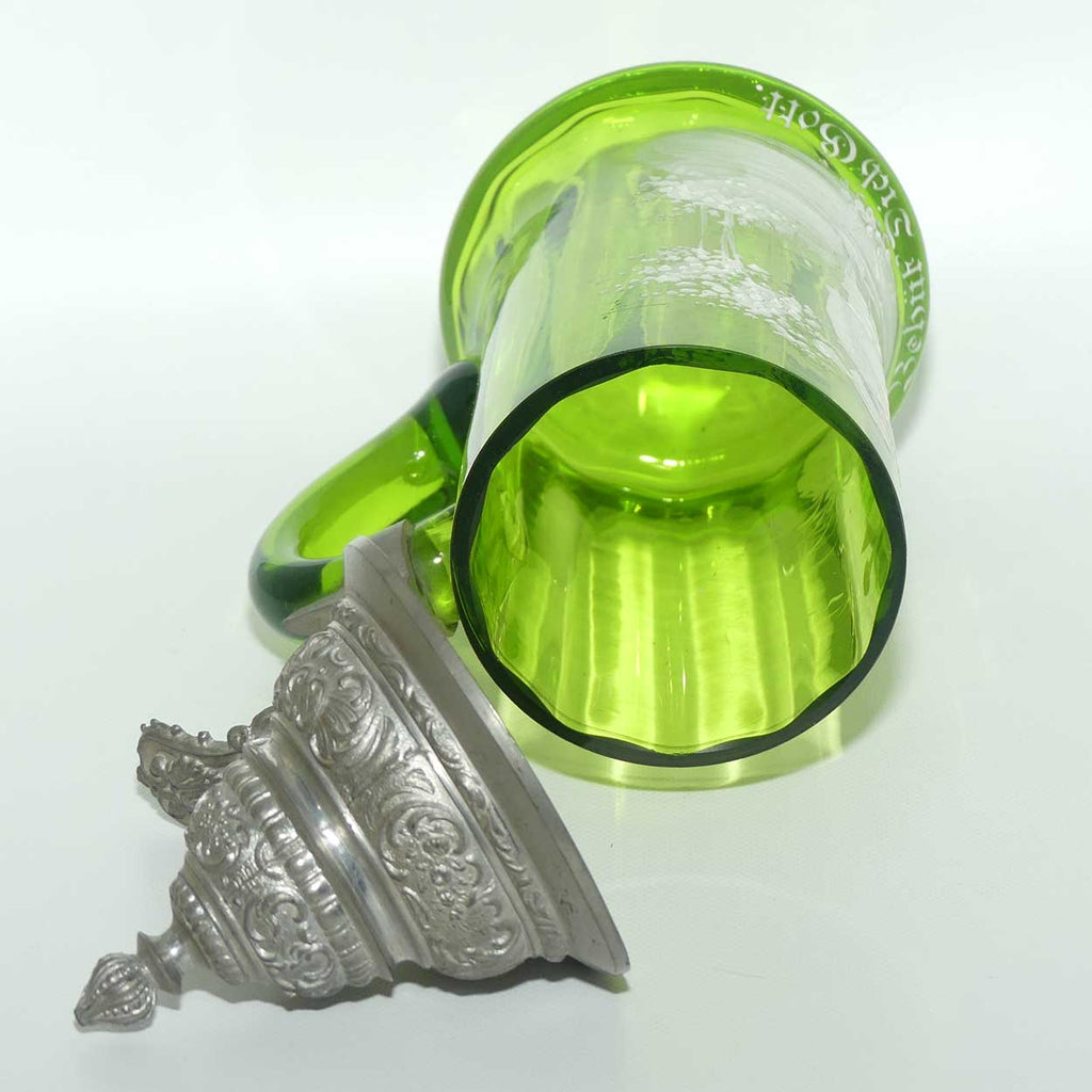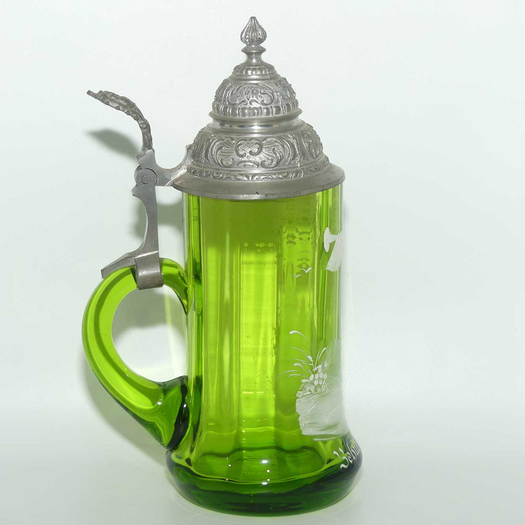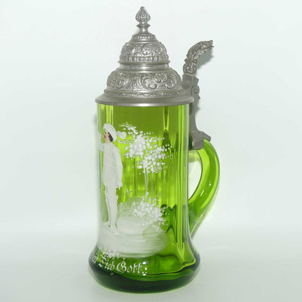 Green Mary Gregory Glass stein with pewter lid and decorated with handpainted Cavalier and the motif "Behut Dich Gott" (translated means Godspeed).