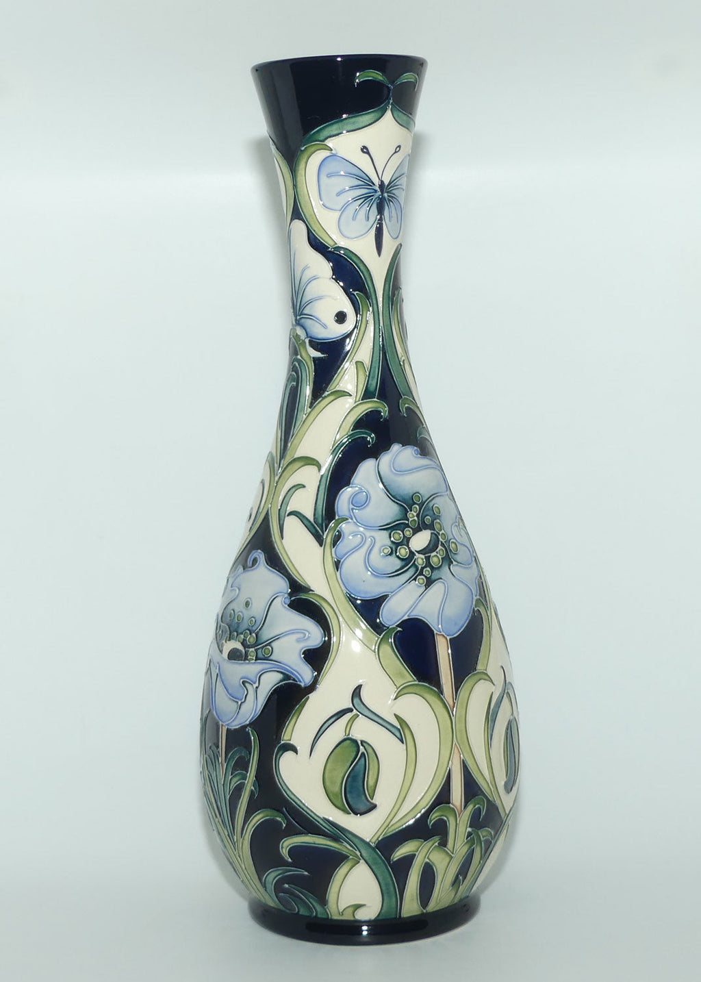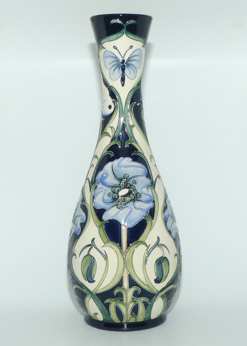 Rachel bishop [Senior Designer] Study in Blue depicts the two favourite things that bring her joy, butterflies and poppies. In the true Bishop idiom, four stylised poppies on a deep blue ground are separated by ivory panels, each one depicting a hanging bud and edged with stylised leaves. Two butterflies sit within the top of the white panels and two rest on leaves in the deep blue. A Florian inspired Moorcroft "classic design".