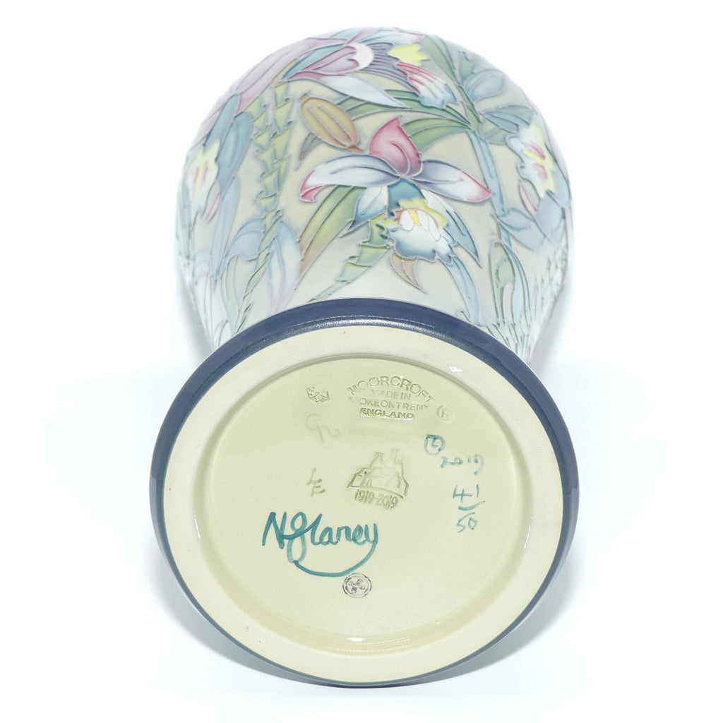 About Arundina: From 1918 onwards, William Moorcroft drew a dramatic range of designs which featured irises, narcissi, orchids and other flowers drawn in a naturalistic style over the surface of the pots, often on dark grounds. Some of these designs were inspired by his father, Thomas Moorcroft’s botanical drawings. One such drawing was a watercolour by Thomas of orchids, probably drawn at Trentham by permission of the Duke of Sutherland. For this, he received a Silver Medal in 1875, from the Department of Art and Science’s national competition.