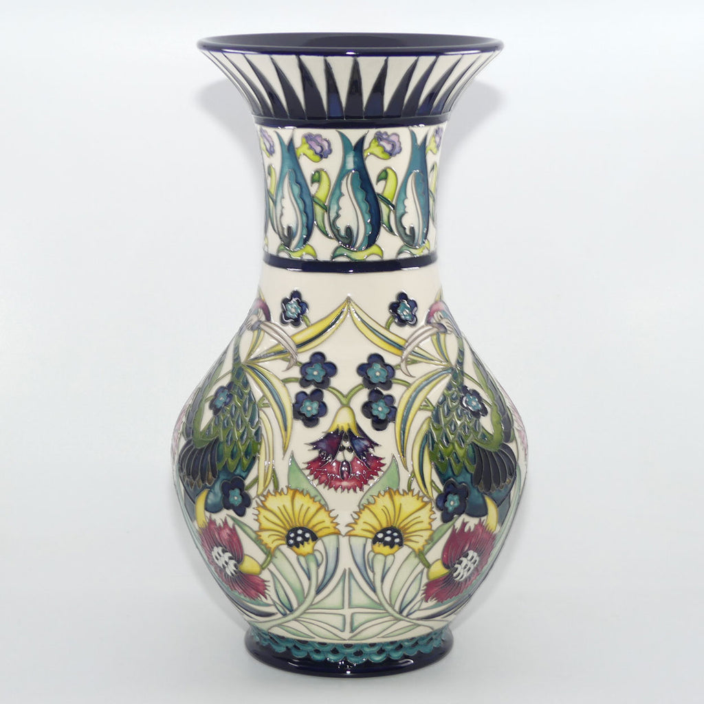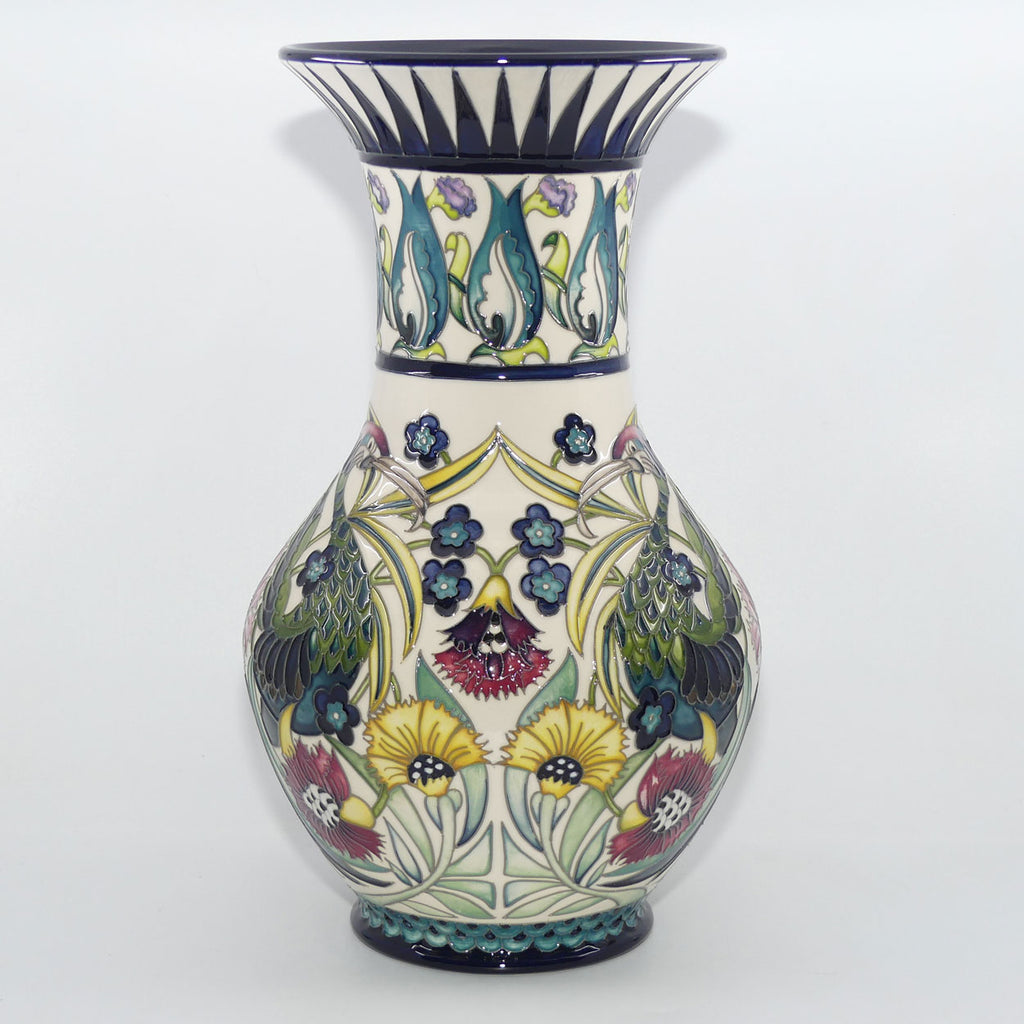 In this Moorcroft design, tulips, carnations, cornflowers, forget-me-nots and other flowering plants seem to sway gently in a breeze, following the curved vase shape. The kaleidoscope of colours of 16th century Iznik pottery, where bold designs featured plant and flower-based patterns, weaves its way around the base of the vase. The colours change from coral pink and maroon carnation flowers, to Persian-style pale-blue tulips and striking yellow cornflower daisies, by a network of foliage where repeat patterns appear to be an illusion and a garden erupts before your eyes. In contrast, the neck of the vase is circled by a chain of tulips pointing towards the rim of this baluster-shaped vase which is itself flagged with a symmetrical Islamic style triangular pattern.