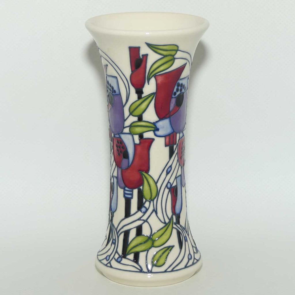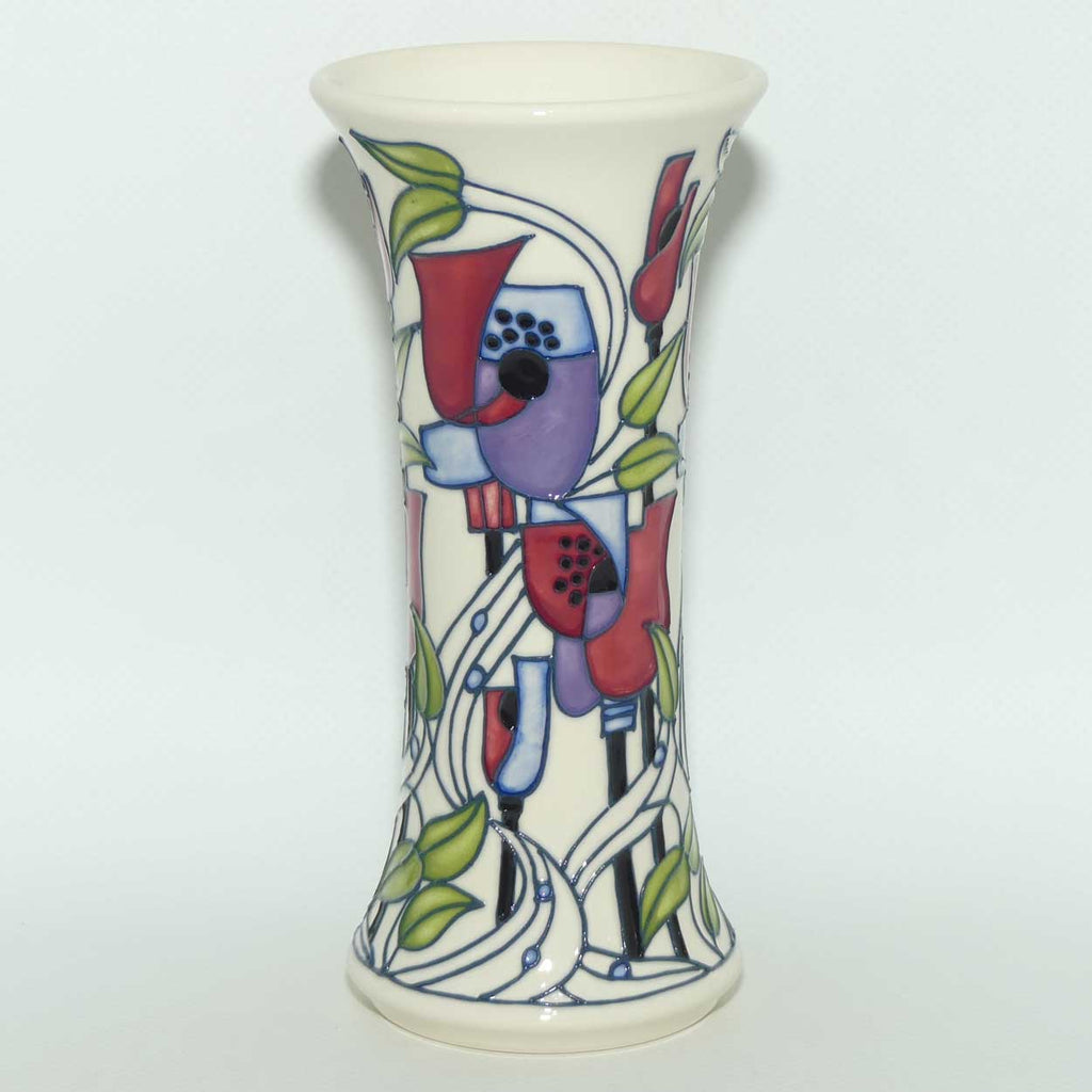 In 1914 Charles Rennie Mackintosh left Glasgow and moved to his new home, Millside, in the village of Walberswick on the Suffolk coast, where there was a small artists’ colony. The intention was to find peace and seclusion. He devoted himself to watercolour painting and produced some of the finest flower studies of his career. Here Mackintosh could wander the quiet country lanes and grow plants in his small garden and enjoy watching nature come alive. Flowers such as tulips reoccurred in his art and continued in his later textile designs. His designs showed his lifelong interest in plant forms, and it was these floral motifs of Mackintosh’s that inspired Rachel. The stylised tulips and lattice work in Millside have a jewel like quality, enhanced by Rachel’s clever use of coloured tubelining slip.