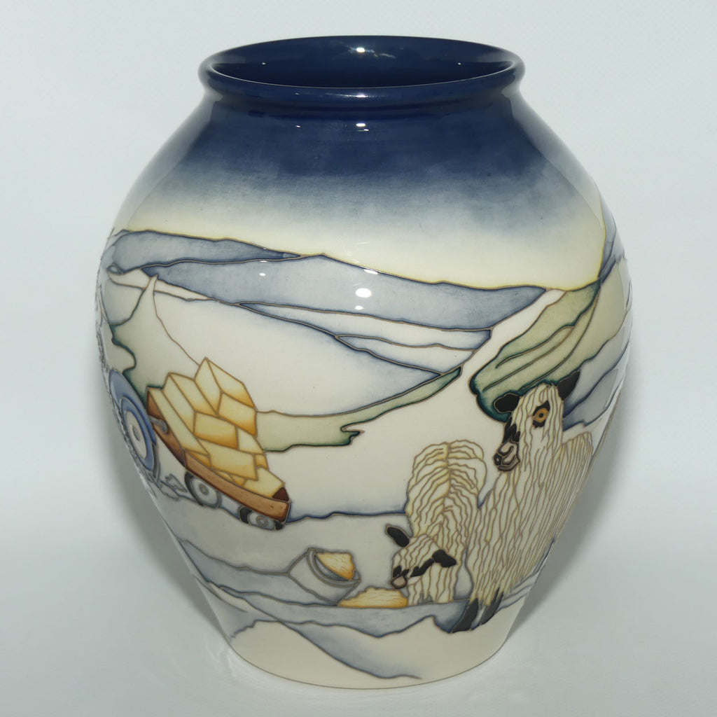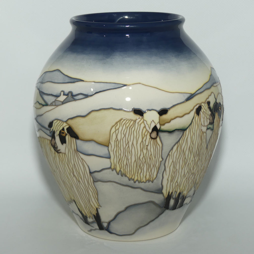 As well as their striking markings, it was the lustrous, white ringlets, not unlike the darker ringlets of the designer herself, of this rare breed that captured Kerry’s heart. The Moorcroft designer takes this curious Longwool herd into the bleak basalt and limestone moorlands of Teesdale. Humorously, and unaware of the drama of their own panda-like faces, the sheep turn and stare at a tractor abandoned in the rough and high-gradient terrain, its trailer laden with bales of hay, as if bemused by its awkward parking. Softly, a flurry of snow covers the Pennines, as well as their divine ringlets, with pristine white to create the perfect backdrop for these Mug Tups.