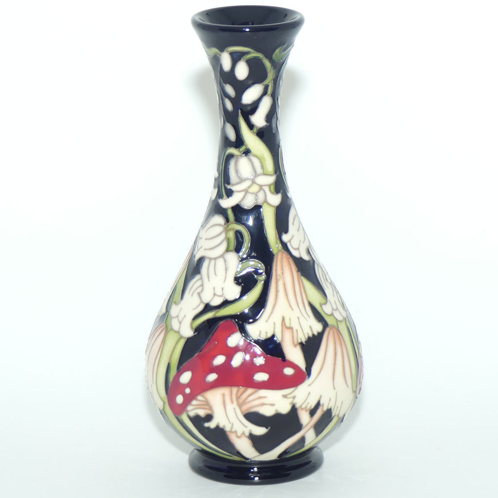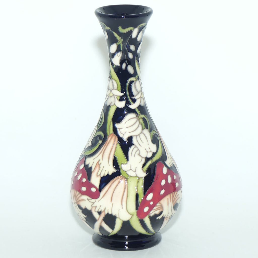 Cornelian-red toadstools with tiny white spots display their vibrant parasols under a shower of the woodland bloom, Lily of the Valley. Hanging like medieval lanterns, the bell-shaped white pendent blooms rise up through large lance-shaped dark green leaves against an inky-blue ground, electrifying the design with the magic of dusk. Whilst snowy bells ring in the Harvest Moon, toadstools, said to grow where fairies dance, leap into pillars of red jubilation as if commanded by the Sorcerer’s Apprentice.