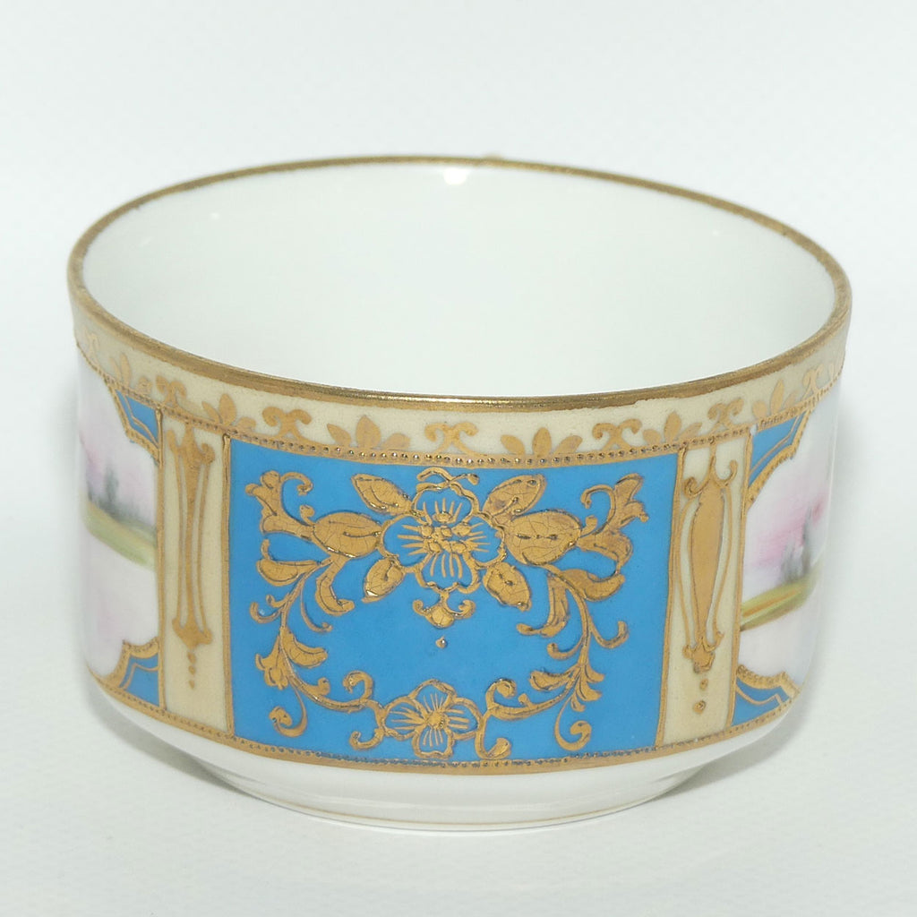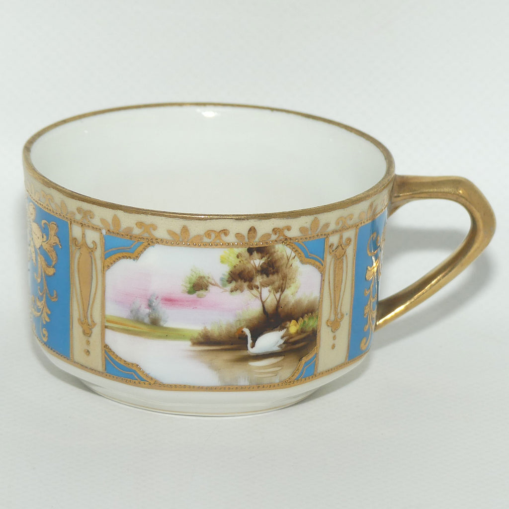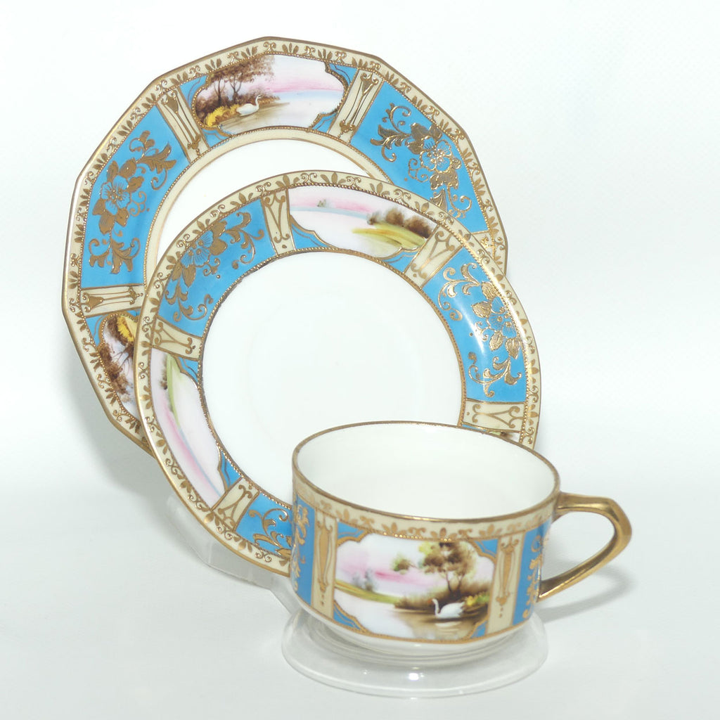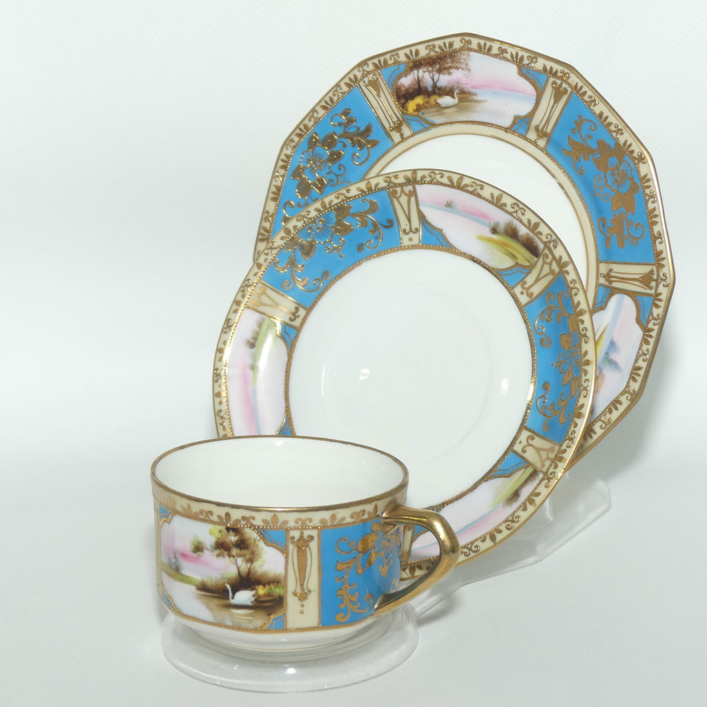 Early Noritake Hand Painted and Gilt decorated Blue ground tea trio | #1 | Lake Scene