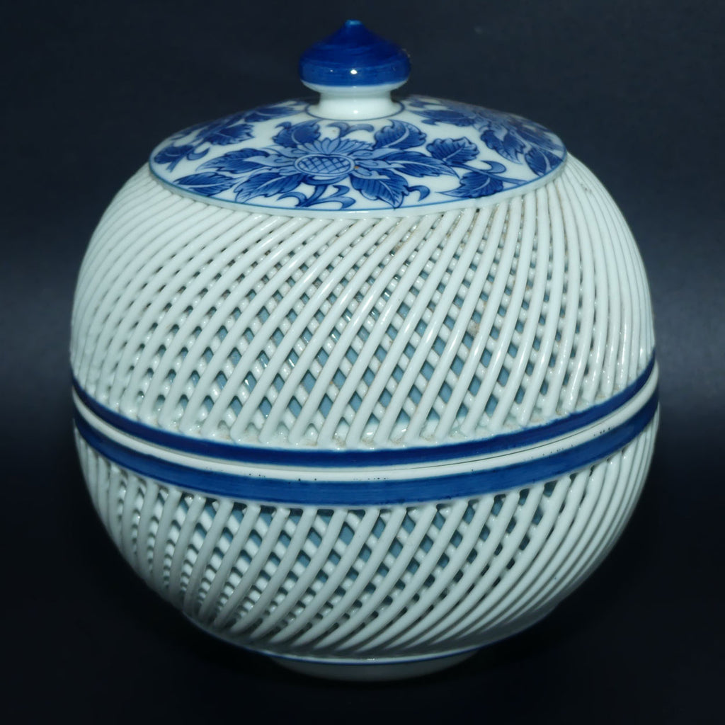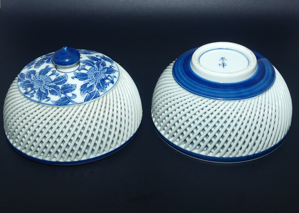 From the estate of a world traveller, this Japanese Hasami Ware Porcelain Covered Box or Lidded Bowl is decorated with an open work lattice design called Sukashi and was produced by the Kinpo Kiln - circa 1990
