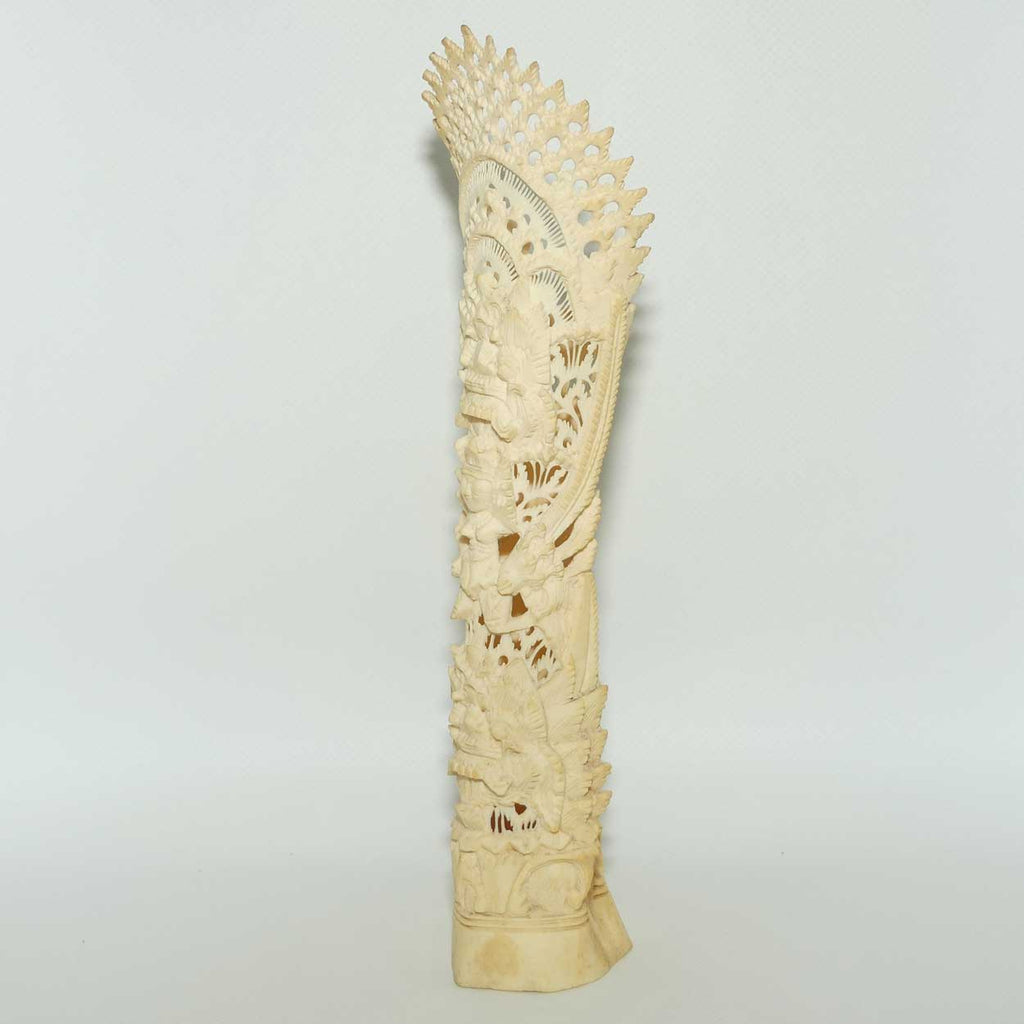 Rangda is often depicted as an old woman with long hair, claws, fangs, and a protruding tongue. Her face is carved from wood or stone and covered by a white veil to prevent anyone from accidentally seeing her.