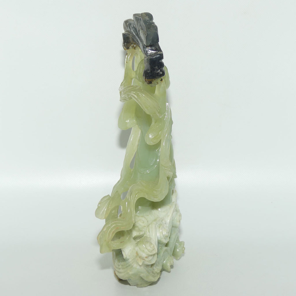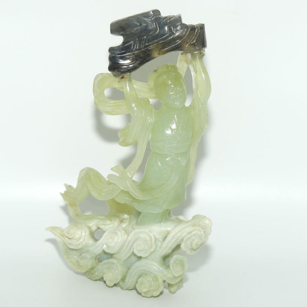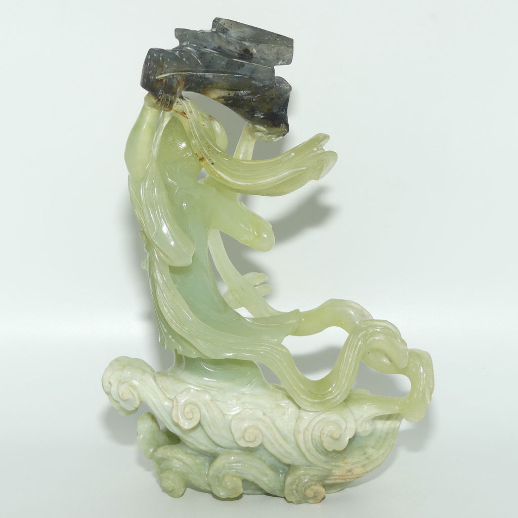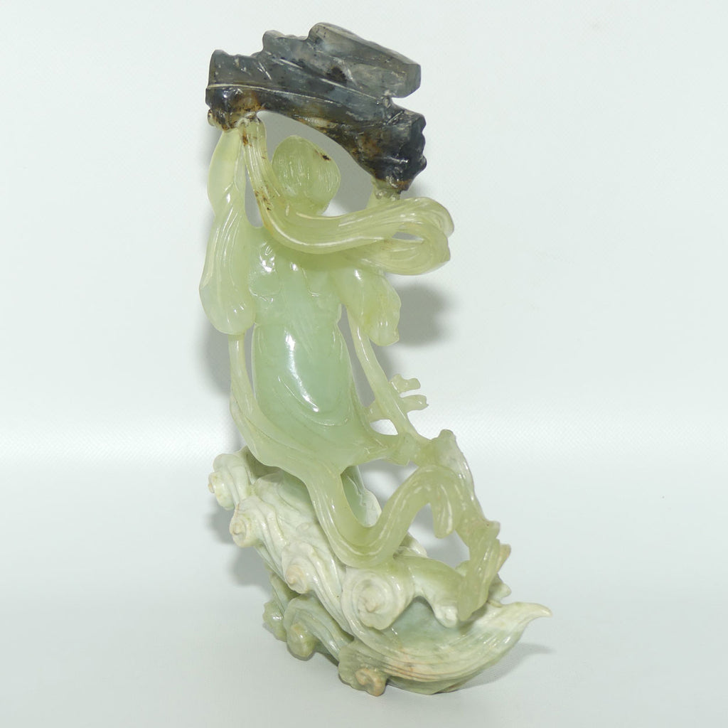 Mid 20th Century Chinese Nephrite Green Jade Carrying Log to Afterlife on stand