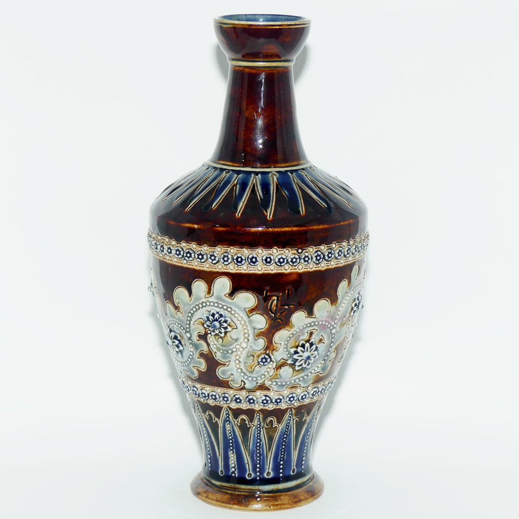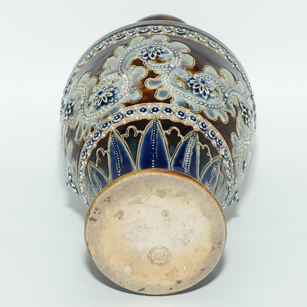 An elegant Doulton Lambeth vase decorated by George Tinworth with foliate beads and Brown and Blue glaze