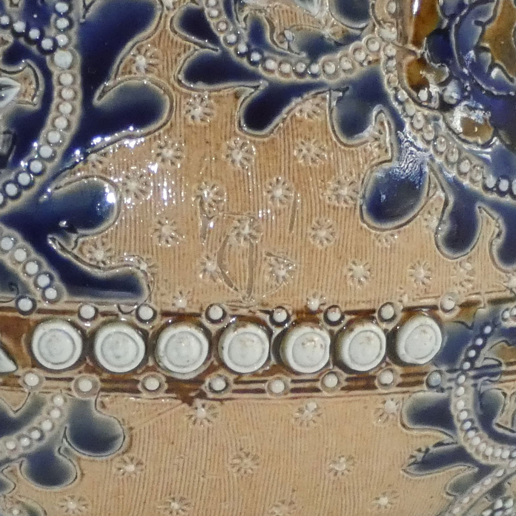 by George Tinworth (signed to body of jug) and Eliza L Hubert (signed to base of jug)
