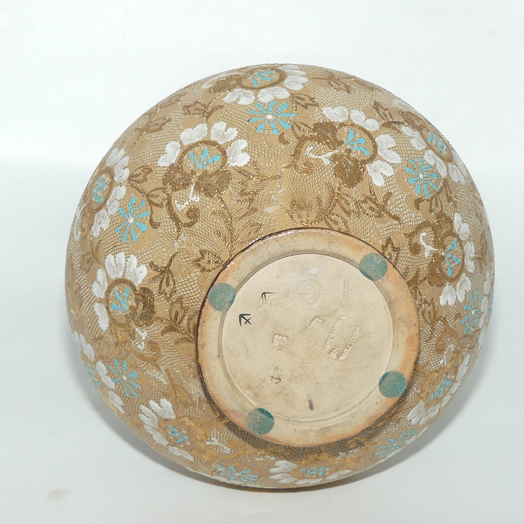 Born in 1844, John Slater was the Art Director at Doulton & Co, Burslem from 1887 until his death in 1914. He was involved in the development of many of the special glazes and techniques including Doulton & Slaters Patent. This process involved the use of lace fabrics impressed into the surface of wet clay, to produce a decorative floral technique. When the clay dried to biscuit form, the lace fabrics were removed and the resultant impressed patterns were gilt and hand enamelled.