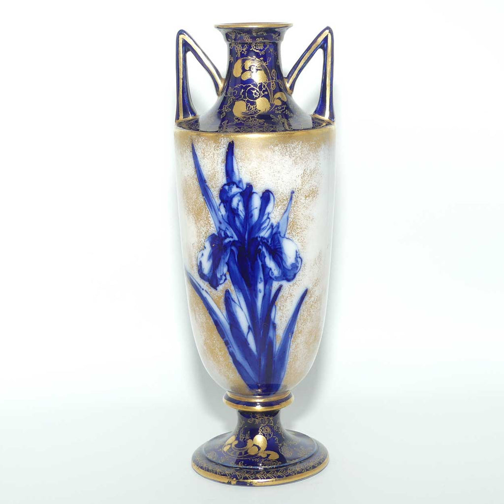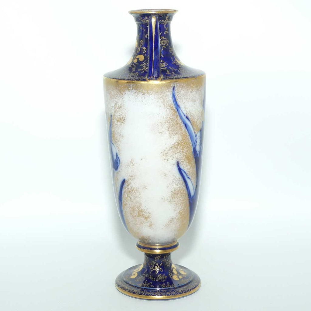Doulton Burslem Blue Iris and Daffodil tall slender vase with twin handles and gilt highlights