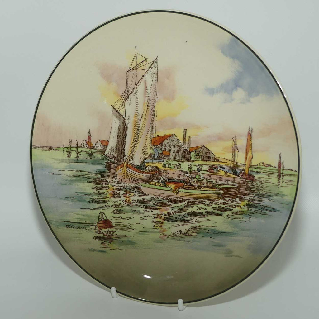 Scene 3: Unloading two barges at front of stone pier and sheds with chimneys in background