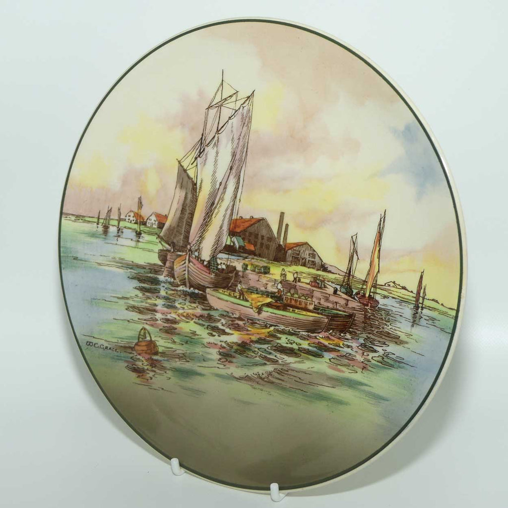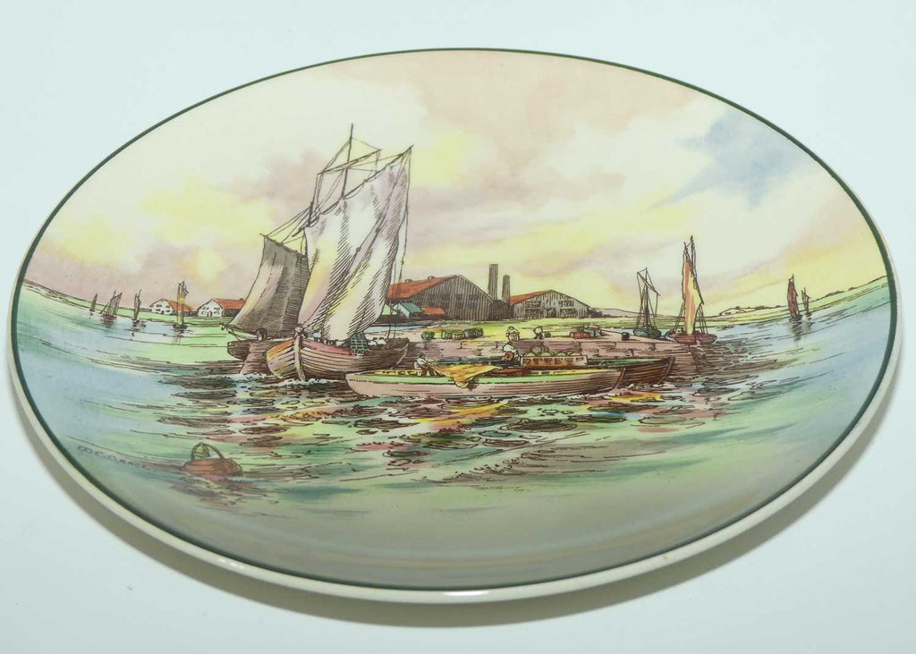 Scene 3: Unloading two barges at front of stone pier and sheds with chimneys in background
