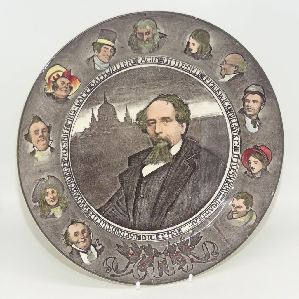 Plate depicts Charles Dickens in portrait form, together with many famous characters from his novels including Fagin, Little Nell, Mr Pickwick, Bill Sykes, Little Dorrit, Uriah Heap, Captain Cuttle, Barnaby Rudge and Sam Weller