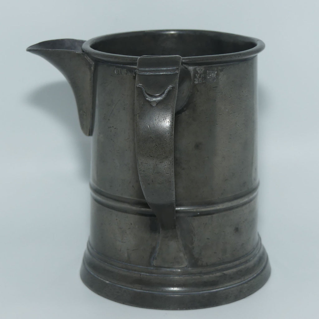 It is marked QUART and on the other side of the handle VR 352 (which was the locale CHECK mark for Kent used from 1879 I understand - so the "then" Government equivalent to Weights and Measures has done a check that the measure was accurate) - which only means it was checked at that time - my research indicates the piece was a design used from the William IV era onwards - so most likely an 1840s piece.