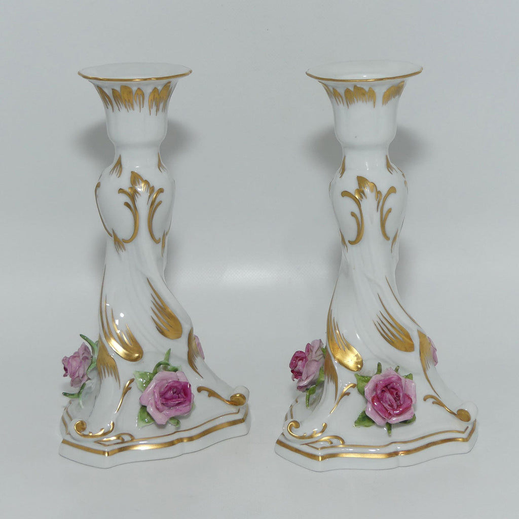 Each candlestick has 3 applied Roses, on one rose on one candlestick, instead of 3 green storks around the leaves, there are 2 - it would appear one never formed correctly when fired and has been coloured over in the factory - it is something only the keenest eye will ever notice if someone points it out