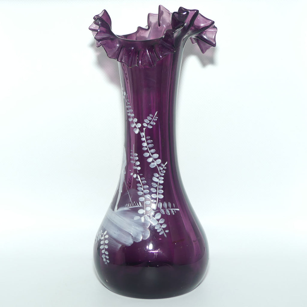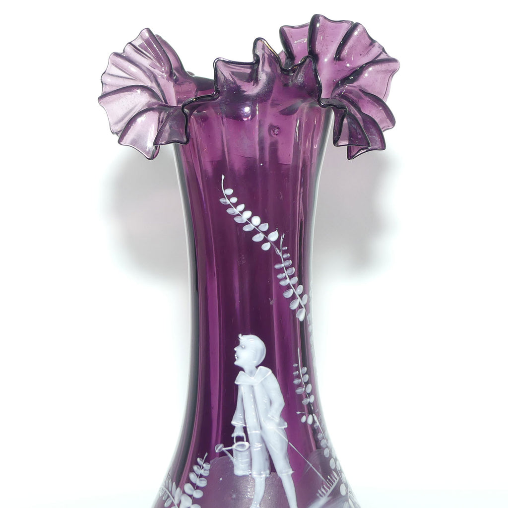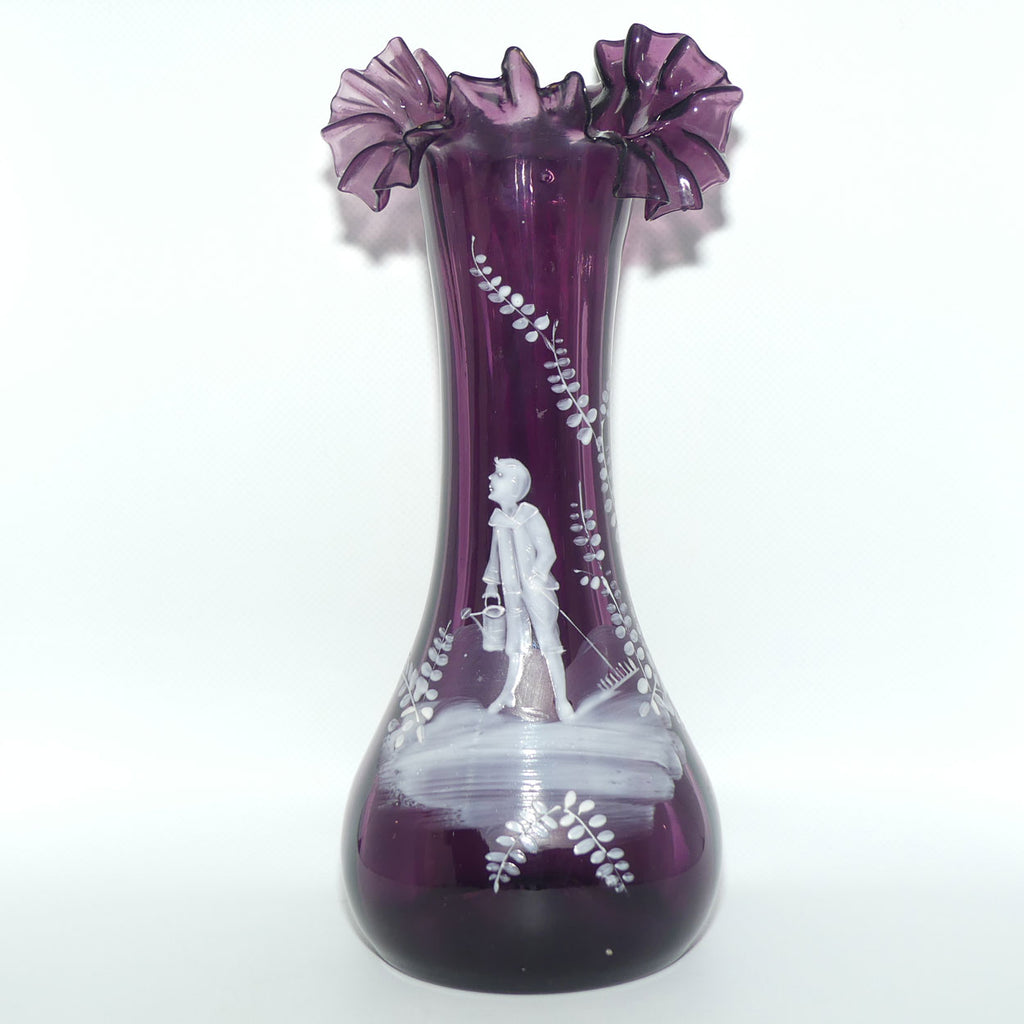Amethyst glass Frilled Top Mary Gregory vase depicting a Boy with Watering Can and Cane
