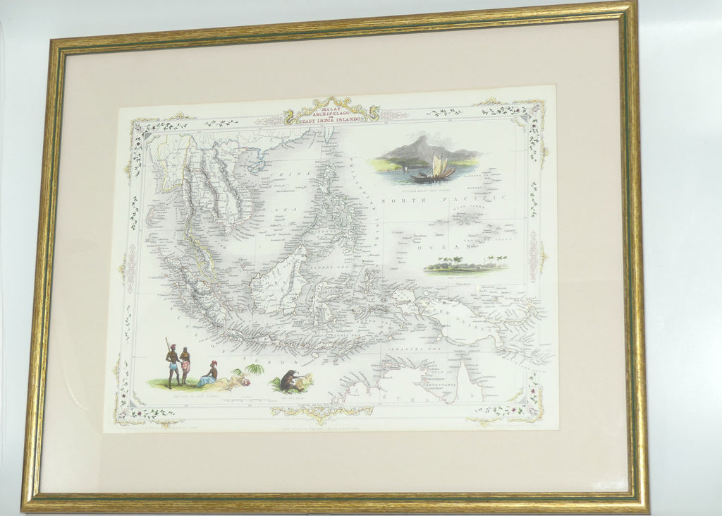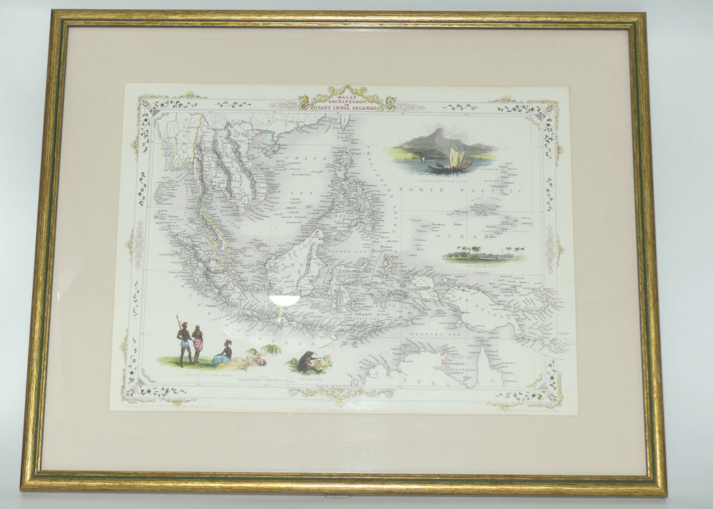 Nice framed example of this decorative regional map, covering the Malay Archipelago