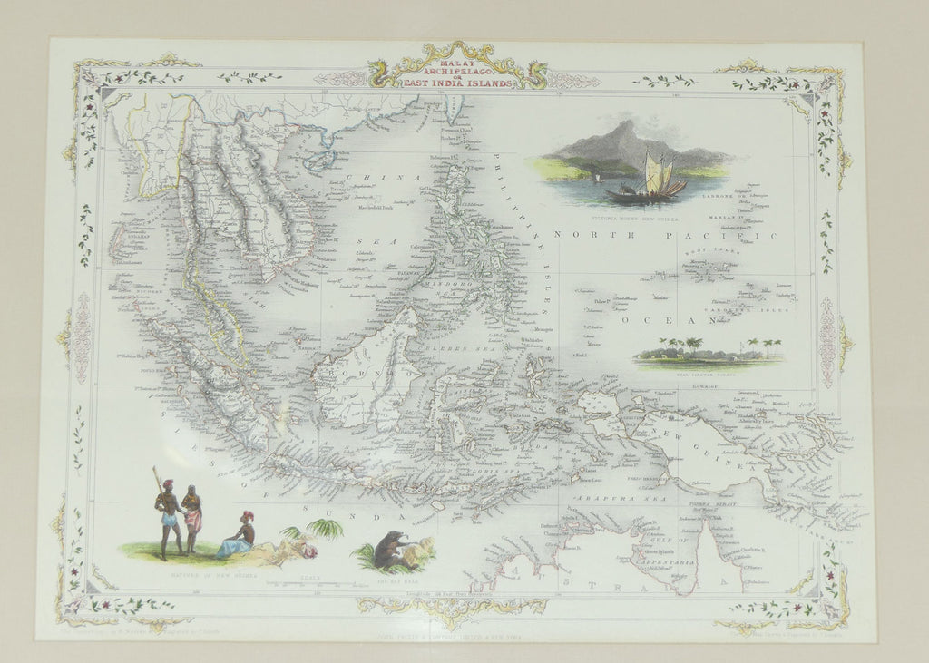 Vignettes: Victoria Mount - New Guinea; Near Sarawak - Borneo; Natives of New Guinea; The Bee Bear. The map covers the area from Burma and South China to the Torres Strait/Gulf of Carpentaria/North Australia; Includes the modern states of the Philippines, Indonesia; Indochina, Sunda Islands, New Guinea, Borneo, Sumatra, Java. Marked on the map are Siam, Cochin China & Martaban Tenasserim, Hong Kong & Singapore. Tallis was one of the last great decorative map makers. His maps are prized for the wonderful vignettes of indigenous scenes, people, etc.