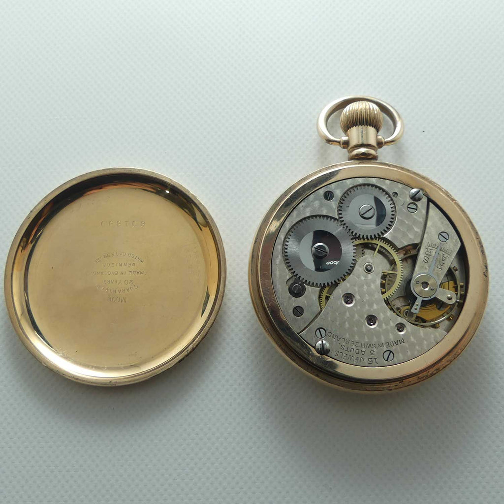 Inside the back is marked MOON GUARANTEED 20 YEARS MADE IN ENGLAND DENNISON WATCH CASE CO Ltd and the model 891880