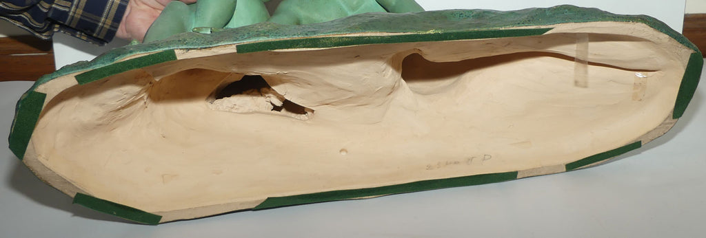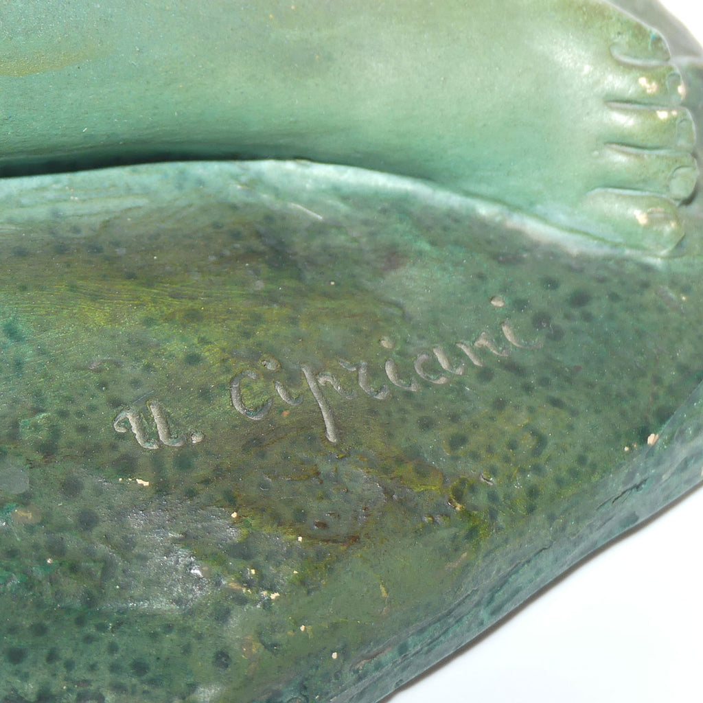 This figure was sculpted by Art Deco artist Ugo Cipriani, and produced in terracotta clay, that was then finished in the Green Vertigris copper finish to simulate aged bronze and was produced by Terre Cuite D'Art studio
