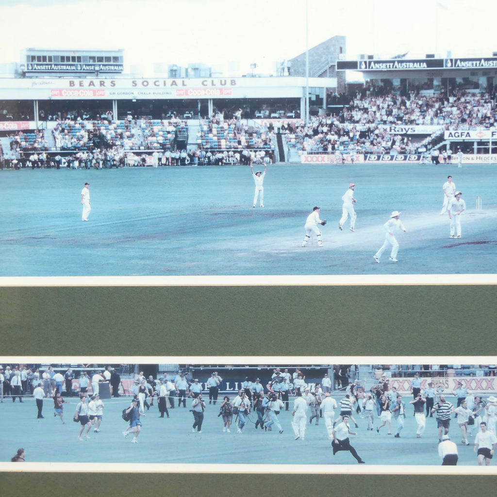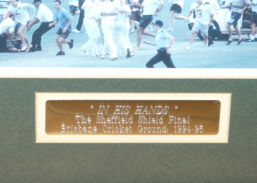 'In His Hands' is a panoramic photograph of The Sheffield Shield Final, Brisbane Cricket Ground 1994-95 which depicts Queensland's elusive first win, window mounted, framed & glazed together with companion panoramic photograph of the crowd celebrating on the pitch, window mounted, framed & glazed - finished with a descriptive framed brass plaque
