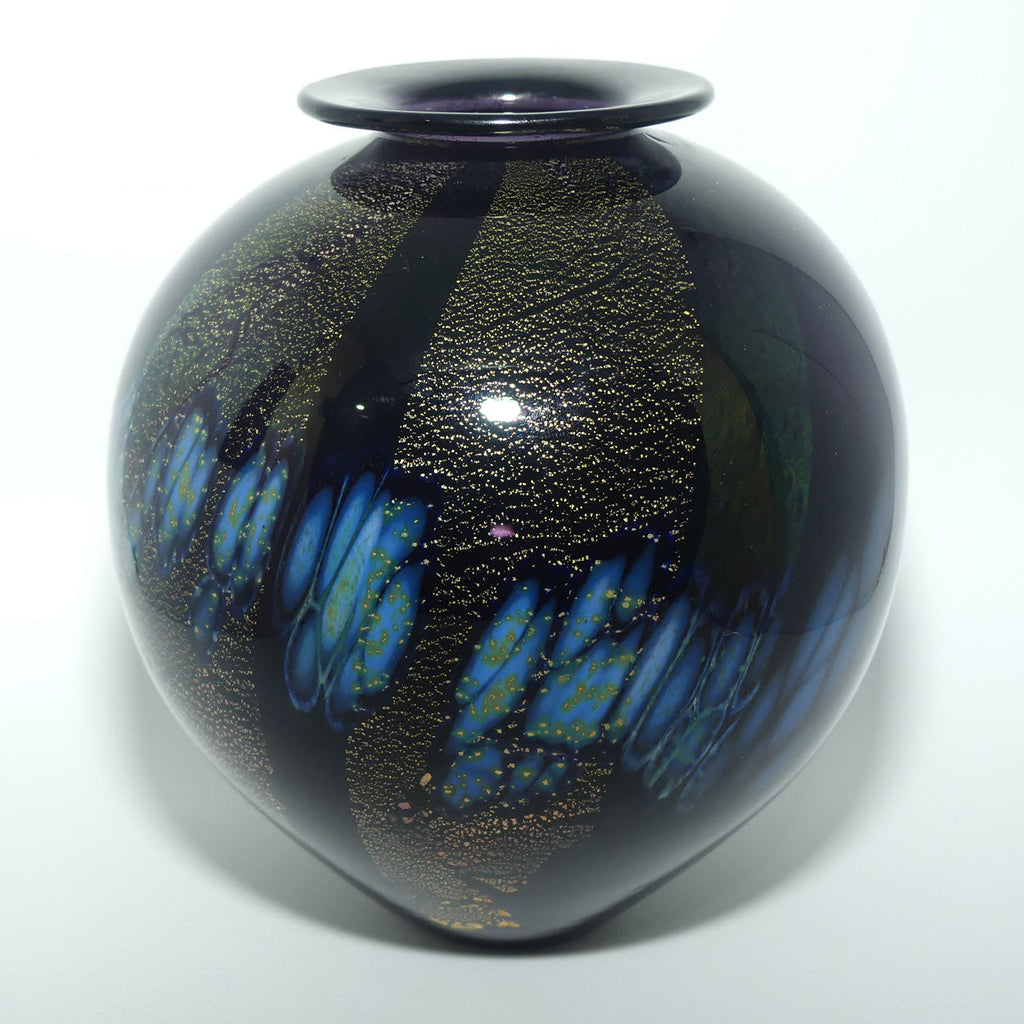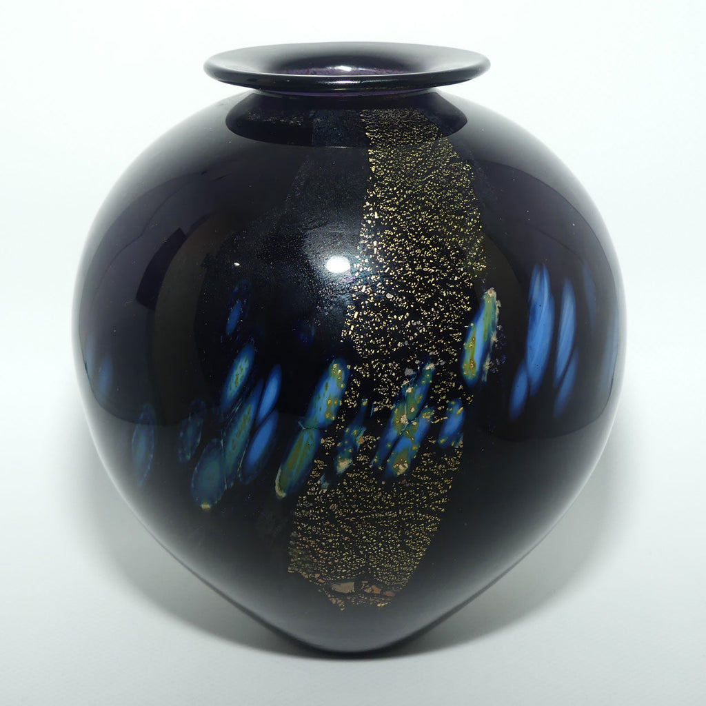 This Dark Amethyst Glass vase has gold fleck and blue variegated patterns interspersed through the vase