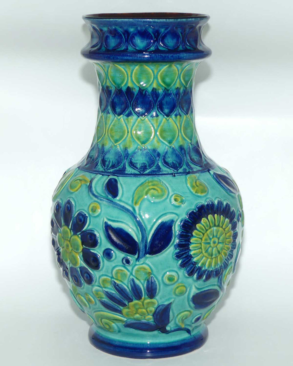 This beautiful piece, is from the Seefeld Decor, “Bay Topfermeister Kollection” (Pottery Master Collection), known to have been in production, between 1969 - 1973, showcasing a truly superb design on the body, adorned with both floral décor and modern, abstract shapes, glazed with a wide range of blue, green and yellow-coloured hues (see photos.) The inside of the vase, is a warm, chocolate brown colour, with hints of burnt umber, which looks very cool in contrast with the other colours.