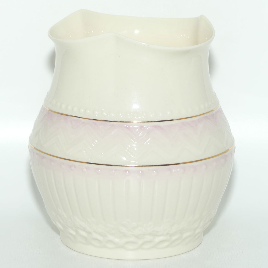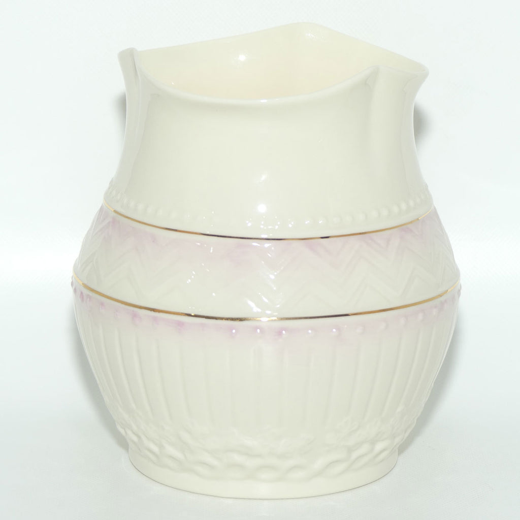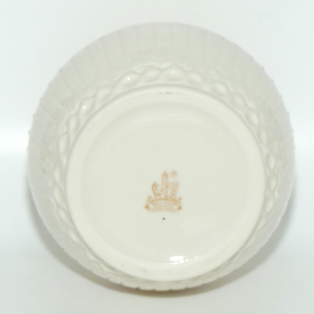 Please note re: confusion of Gold mark or Brown mark: In April 1980 the seventh mark was introduced to commemorate the Centenary of Gold medal won by Belleek at the Melbourne Exhibition of 1880. The colour was changed to gold and the round disk with "deanta in eireann" was omitted. At sometime around 1984 the gold colour on the mark was substituted with a browner toned gold colour to improve the clarity of the backstamp