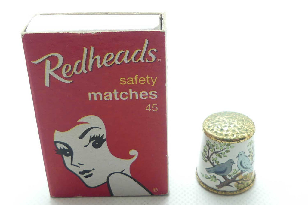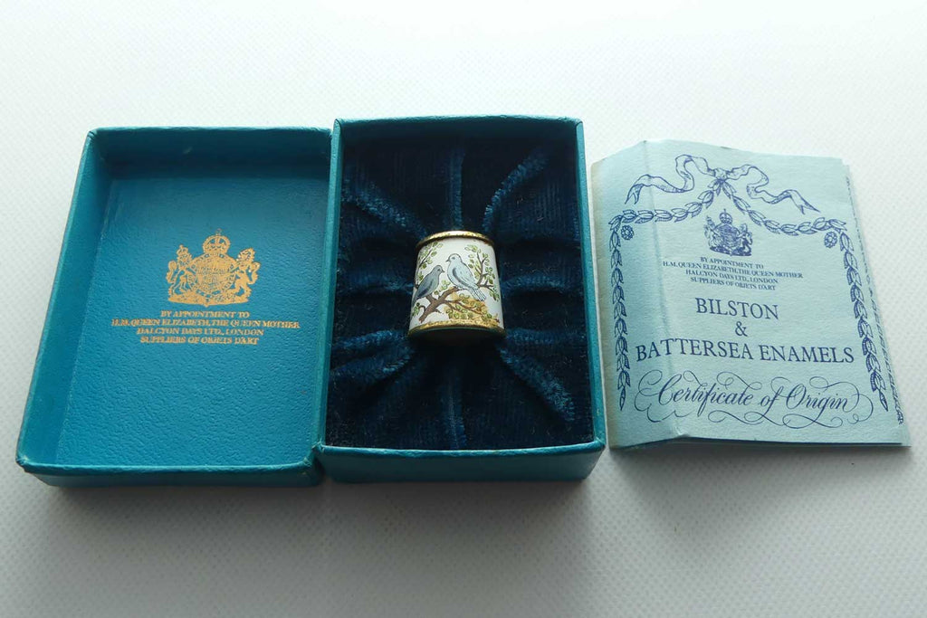 The thimble has two Birds on branches of a tree on the front, and a Peace dove on the rear