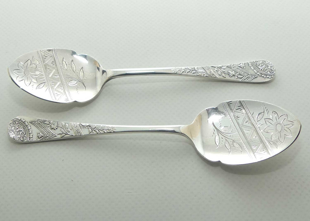 Beautifully decorated pair of spoons in a superb Velvet and Satin presentation box - some of the best late Victorian early Edwardian era classical style