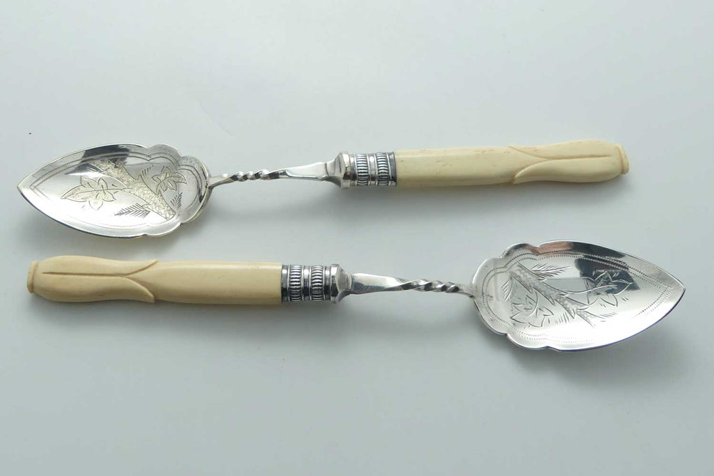 Some fissuring along the grain line of the bone at the handle junction, but they are still quite secure (old bone does dry out over 100 years!). The box and the spoons are in remarkable condition for age