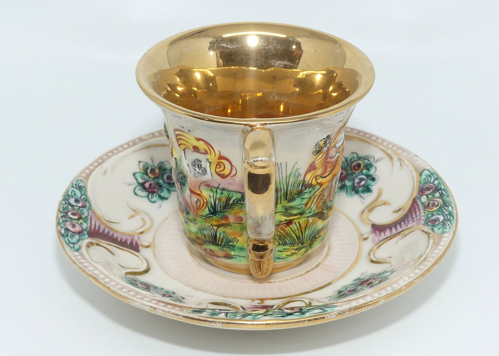 Both cup and saucer are decorated in a raised relief pattern, and gilt trimmed