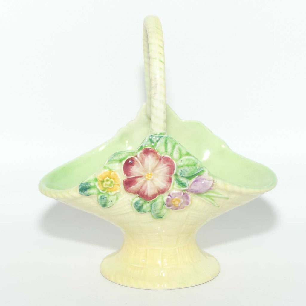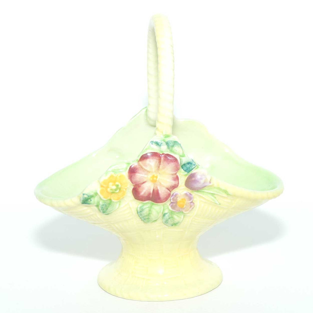 This basket shaped posy holder with handle is in excellent condition and good colours nicely painted on a yellow ground. Carlton Ware at its prettiest. Smaller of two sizes produced.
